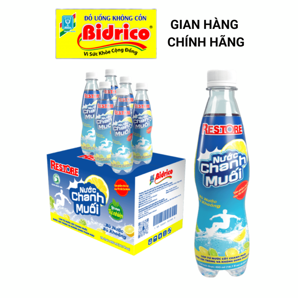 Nước Chanh Muối Restore ( Thùng 24 chai 495ml ) - Sản phẩm của Bidrico Đã khát và sảng khoái Nước chanh muối Restore 495ml vinh dự là sản phẩm chủ lực Tp.Hồ Chí Minh giai đoạn 2018-2020 và 2021-2025. Đồng thời là sản phẩm, dịch vụ tiêu biểu TP.HCM năm 2017 – 2023 và Sản phẩm công nghiệp và công nghiệp hỗ trợ tiêu biểu TP.HCM năm 2022 – 2023. Thông tin sản phẩm: