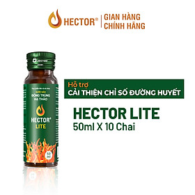 Nước nấm Đông trùng hạ thảo Hector Lite là sự kết hợp giữa chiết xuất nấm Đông trùng hạ thảo và các dược liệu thiên nhiên mang nhiều lợi ích cho sức khỏe.  Hector Lite không có đường mía phù hợp cho người mong muốn kiểm soát chỉ số đường huyết trong cơ thể.  Thành phần:  Trong mỗi chai nước nấm Đông trùng hạ thảo Hector Lite 50ml chứa: chiết xuất Đinh lăng 900mg, chiết xuất nấm Đông trùng hạ thảo 500mg, chiết xuất Khổ qua 300mg, chiết xuất Chùm ngây 300mg, rễ Cỏ tranh 150mg, chiết xuất​​​ ​​​Đẳng sâm 150mg, chiết xuất​​​​​​​ Hoa Actiso 150mg. Phụ liệu: Nước tinh khiết, chất điều chỉnh độ acid (L-Acid Ascorbic, Acid Malic), chất ổn định (Xanthan gum), chất tạo ngọt tự nhiên (Đường cỏ ngọt), chất bảo quản ( Nisin, Natamycin), chất tạo ngọt tổng hợp (Sucralose). Công dụng nổi bật: Hỗ trợ bồi bổ cơ thể Hỗ trợ cải thiện chỉ số đường huyết   Đối tượng sử dụng sản phẩm Hector Sâm: Người trưởng thành cần bồi bổ cơ thể Người trưởng thành có đường huyết cao   ​​​​​Hướng dẫn sử dụng: Dùng hàng ngày, lượng dùng từ 1-2 chai vào sáng/trưa Ngon hơn khi uống lạnh, có thể dùng với đá Lắc đều trước khi sử dụng   Hướng dẫn bảo quản: Sản phẩm có hạn sử dụng 12 tháng kể từ ngày sản xuất Bảo quản nơi khô ráo, thoáng mát, tránh ánh nắng mặt trời   Quy cách : 01 hộp 10 chai x 50ml   Khuyến cáo: Sản phẩm này không phải là thuốc. Không có tác dụng thay thế thuốc chữa bệnh. Không sử dụng cho phụ nữ có thai, người mẫn cảm kiêng kị với bất kỳ thành phần nào của sản phẩm. Người bị tiểu đường phụ thuộc insulin, người đang sử dụng thuốc tiểu đường hỏi ý kiến bác sĩ hoặc chuyên gia y tế trước khi sử dụng sản phẩm.