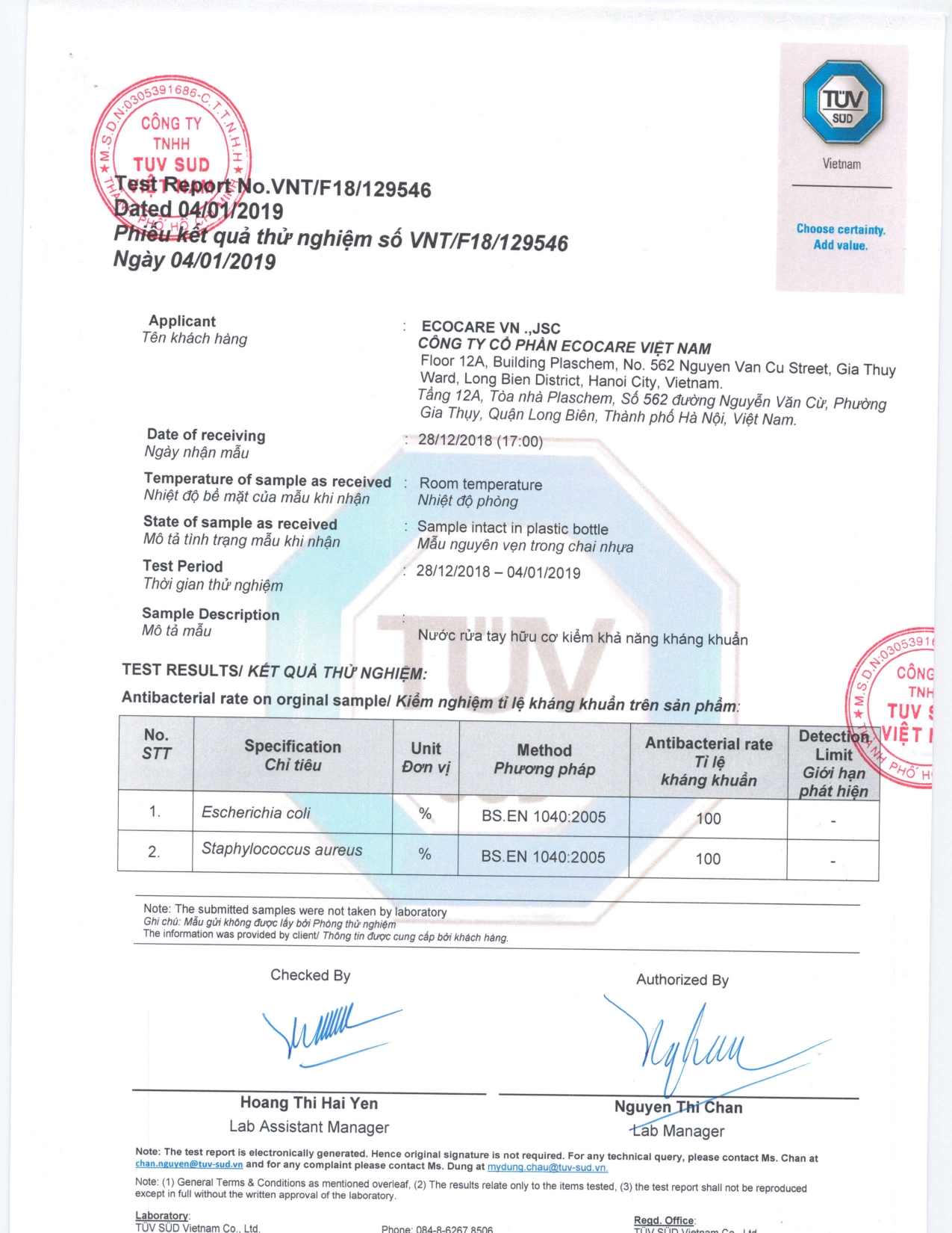 - Nước rửa tay khô đã được kiểm nghiệm tiêu diệt được 99,99% vi khuẩn và các tác nhân gây hại khác bám trên da tay. - Đảm bảo chất lượng Độ cồn đạt tiêu