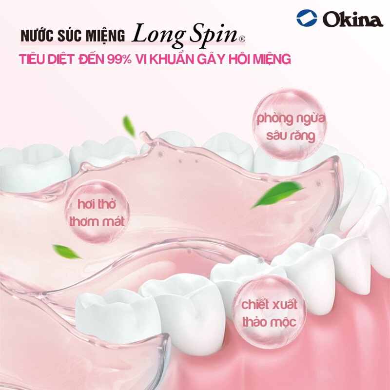 Mua tại Tiktok- Nước súc miệng Long Spin đến từ công ty chuyên về sản phẩm chăm sóc răng miệng Nhật Bản OKINA. Sản phẩm nước súc miệng sử dụng thành phần thảo mộc và nguồn nước sạch từ dòng sông Yoshino thuộc tỉnh Nara, sản xuất theo quy trình khép kín đồng bộ theo tiêu chuẩn Nhật Bản. Thành phần chính có trong nước súc miệng Long Spin là CPC (Cetylpyridinium Chloride) có tác dụng diệt khuẩn đối với nấm, mốc và tụ cầu, và có tác dụng diệt khuẩn chống lại vi khuẩn gây bệnh nha chu gây hôi miệng, làm sạch khoang miệng và giúp lưu giữ hơi thở thơm hơn.