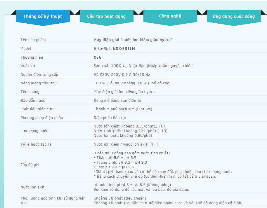 - Sản phẩm được công nhận là thiết bị y tế dùng trong gia đình. SẢN PHẨM CHẤT LƯỢNG Sản phẩm được sản xuất và nhập khẩu 100% nguyên chiếc từ Nhật Bản và đạt các chứng nhận về chất lượng quốc tế & Việt Nam. OSG THƯƠNG HIỆU UY TÍN Hơn 50 năm kinh nghiệm về công nghệ nước, là thương hiệu nghiên cứu & sản xuất nước chức năng toàn diện nhất trên thế giới. BẢO HÀNH CHÍNH HÃNG Được hỗ trợ nhiệt tình từ trước khi mua hàng đến sau khi mua hàng với hệ thống bán hàng và trung tâm bảo hành khắp cả nước. TẠO RA 3 LOẠI NƯỚC ĐA DỤNG Tạo ra 3 loại nước với 5 cấp độ lấy nước chính: nước ion kiềm (thấp, trung bình, cao) pH 8.0 – 9.5 dùng để uống, nấu ăn; nước tinh khiết pH 7.0 dùng để uống thuốc, pha sữa; nước ion axit nhẹ pH 5.5 dùng để rửa mặt, làm đẹp. Đặc biệt, máy có chức năng kích hoạt điện giải ở mức cao tạo thêm 2 cấp độ nước: ion kiềm mạnh pH 9.5 – 10.5 để ngâm rau củ quả loại bỏ hóa chất và ion axit pH 3.5 – 4.5 để sát khuẩn, vệ sinh dụng cụ. THÍCH HỢP SỬ DỤNG CHO NHÀ BẾP Máy nhỏ gọn với công suất tạo nước ion kiềm 3.2 lít/phút, hoàn toàn dễ sử dụng cho gia đình, căn hộ, chung cư, nhà ở, mang đến cho người dùng nguồn nước sạch và tốt cho sức khỏe. LẮP ĐẶT ẨN DƯỚI BỒN RỬA Thân chính với bộ lọc và buồng điện giải được lắp đặt dễ dàng bên dưới bồn rửa và có thể giấu kín bên trong ngăn tủ bếp, mang lại sự gọn gàng, ngăn nắp và thanh lịch cho căn bếp GIẢM TỐI ĐA LƯỢNG NƯỚC XẢ Chúng tôi nỗ lực mạnh mẽ trong việc giảm thiểu khối lượng nước xả bỏ, tỷ lệ nước kiềm : nước axit hiện tại là 4.5:1 so với 3:1 của các loại máy thông thường khác, nhằm hạn chế lượng nước xả bỏ không cần thiết. THÔNG SỐ KỸ THUẬT Tên sản phẩm Máy điện giải “nước ion kiềm giàu hydro” Model Alka-Rich NDX-501LM Thương hiệu OSG Xuất xứ Sản xuất 100% tại Nhật Bản (Nhập khẩu nguyên chiếc) Nguồn điện cung cấp AC 220V-240V 0.9 A 50/60 Hz Năng lượng tiêu thụ 180 w (Tối đa) Khoảng 3.6 W (Chế độ chờ) Tên chung Máy điện giải ion kiềm giàu hydro Đầu dẫn nước Đóng mở bằng van điện từ Chất liệu điện cực Titanium phủ bạch kim (Platium) Phương pháp điện phân Điện phân liên tục Lưu lượng nước Nước Ion kiềm: khoảng 3.2L/phút(± 10) Nước tinh khiết: khoảng 32 L/phút (±10) Nước ion axit: khoảng 0.8L/phút Tỷ lệ nước tạo ra Nước ion kiềm / Nước ion axit: 4 : 1 Cấp độ pH 3 cấp độ (Không bao gồm nước tinh khiết) • Thấp: pH 8.0 ~ pH 8.5 • Trung bình: pH 8.5 ~ pH 9.0 • Cao: pH 9.0 ~ pH 9.5 *Giá trị pH tham khảo và có thể sẽ thay đổi, phụ thuộc vào chất lượng nước.