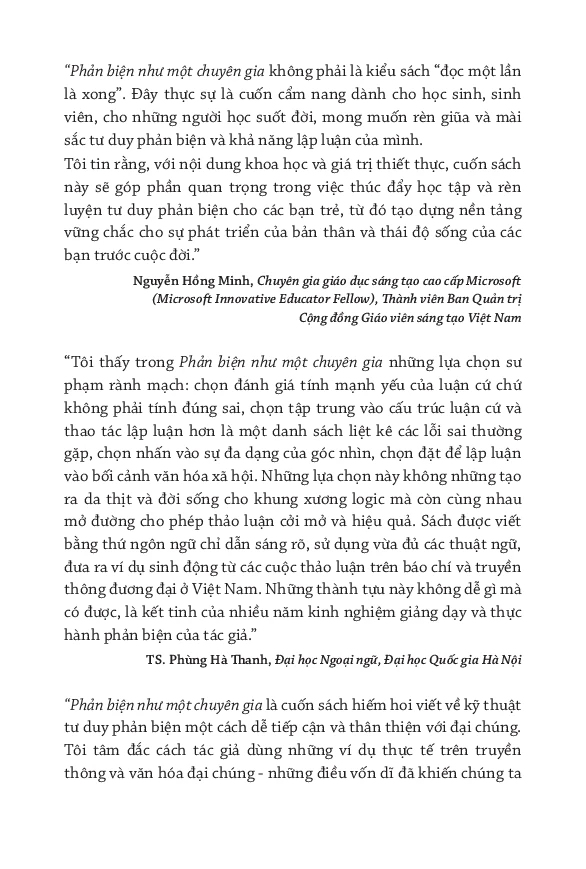 Phản Biện Như Một Chuyên Gia - Lập Luận Sắc Bén Và Tư Duy Hiệu Quả là tác phẩm ra đời với tham vọng dùng góc nhìn phân tích của chuyên gia kết hợp với kỹ thuật lập luận ngắn gọn mà sắc nét của báo chí để dẫn dắt bạn đọc Việt Nam làm quen với tư duy phản biện theo một cách sống động, đầy hơi thở cuộc sống. Bản thảo được tác giả Lang Minh xây dựng dựa trên kinh nghiệm nhiều năm giảng dạy kỹ năng tư duy phản biện và viết các bài nghị luận xã hội cho mục Góc nhìn của VNExpress, nội dung sách kết hợp kiến thức từ sách vở với các ví dụ từ bài viết của các chuyên gia trên nhiều lĩnh vực.