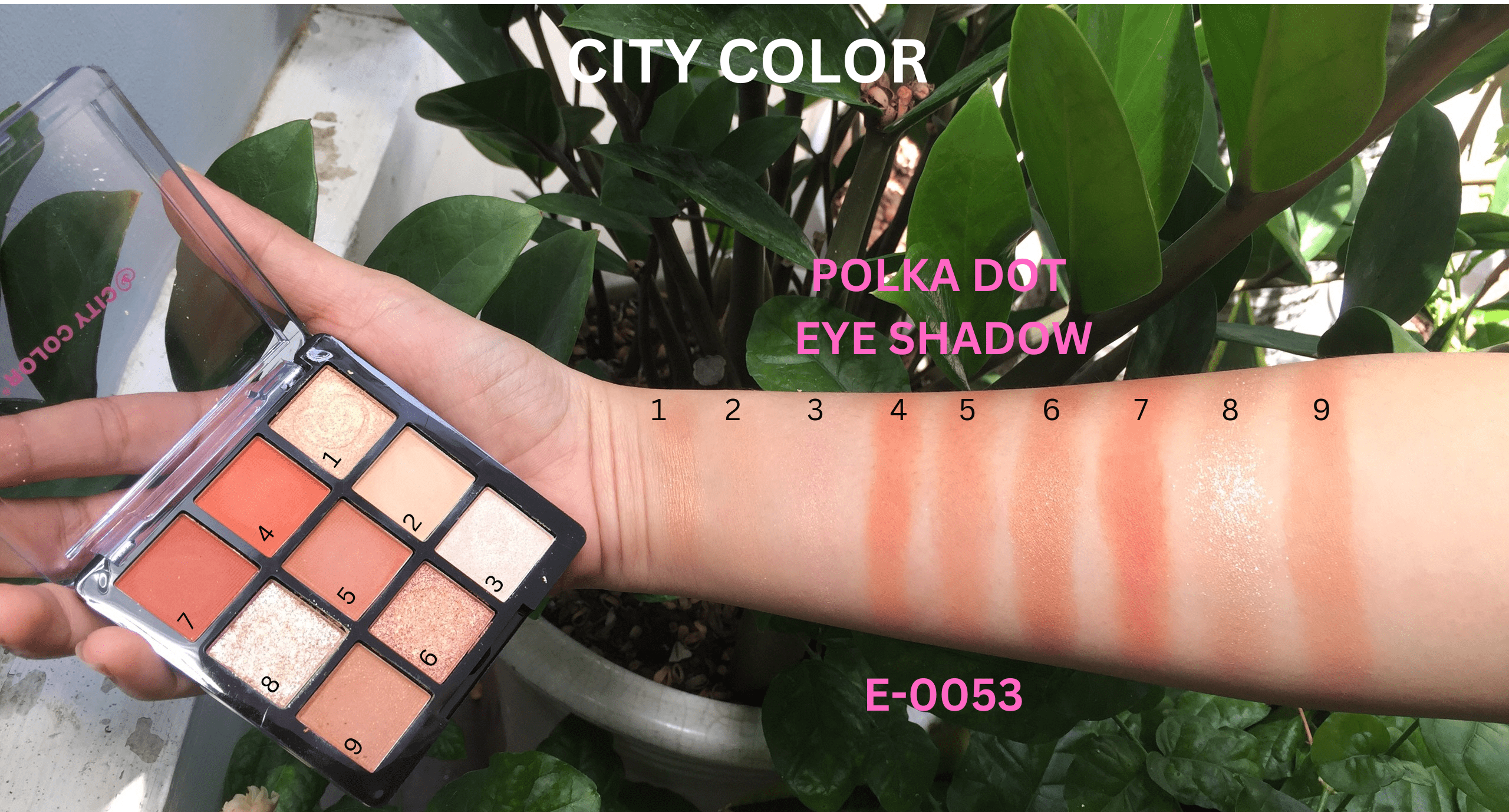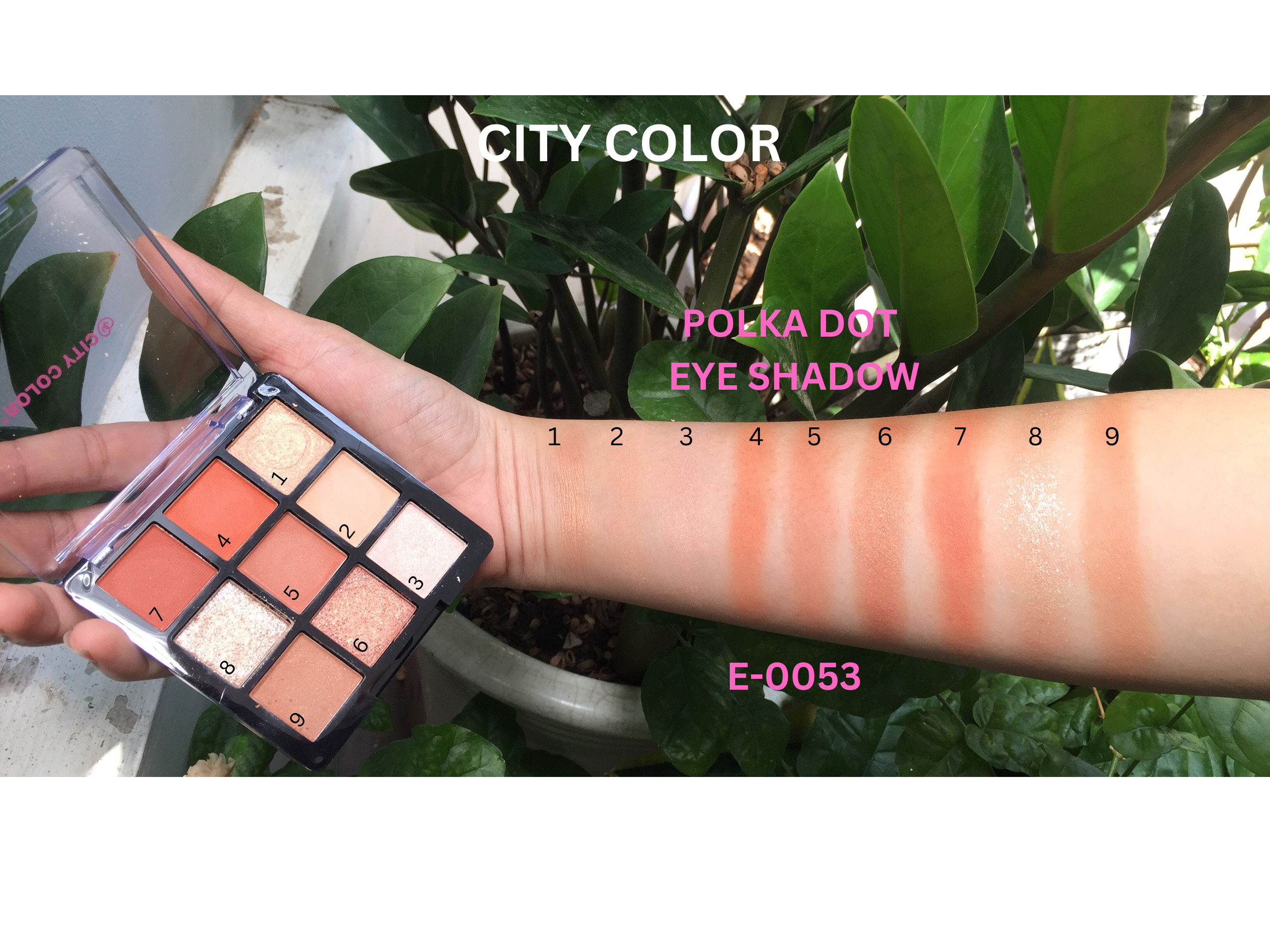 bảng màu Phấn mắt City Color Polka Dot với chín sắc thái được đánh dấu từ 1 đến 9. Bạn muốn mô tả màu sắc cho từng sắc thái trong số chín sắc thái từ