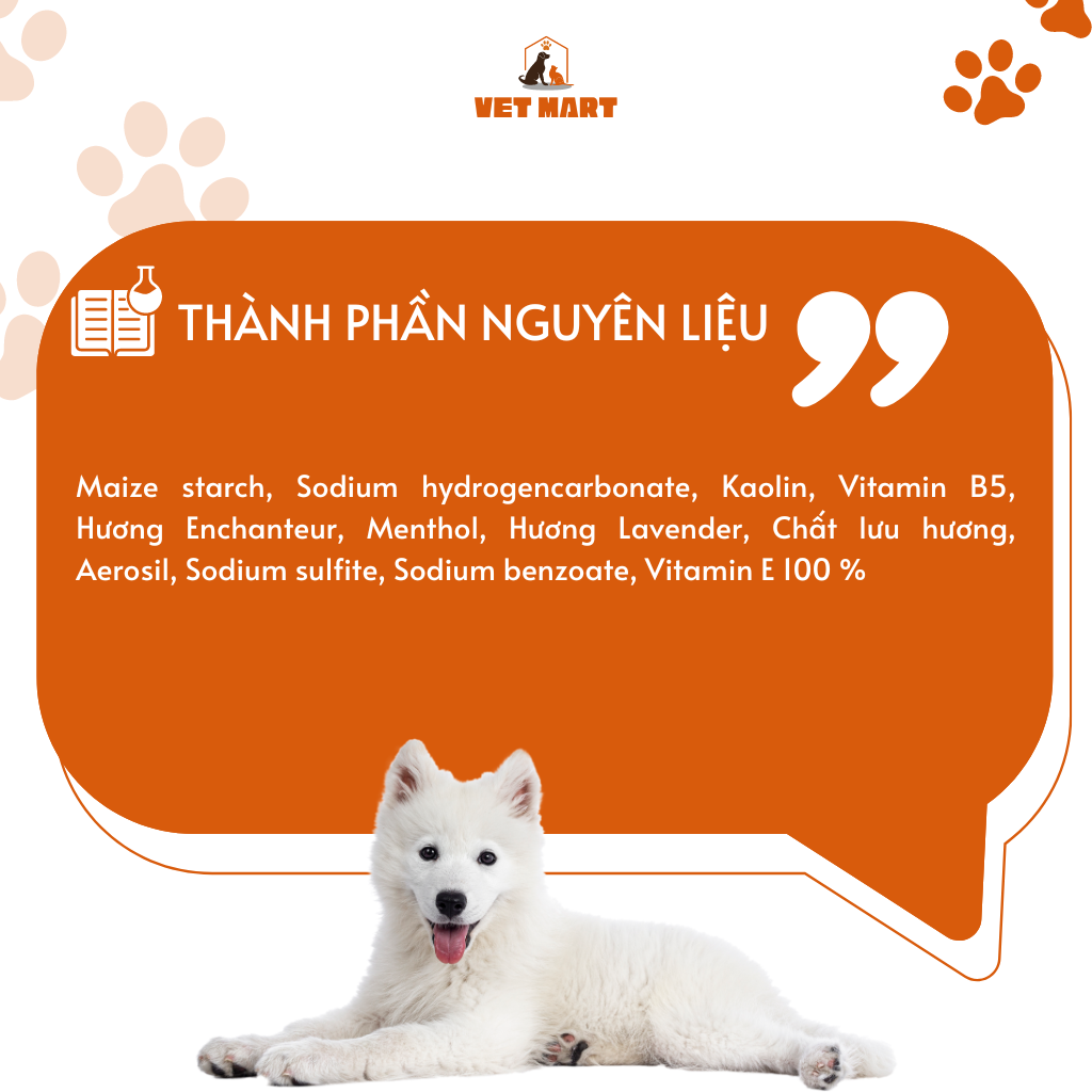 - Đặc biệt, sản phẩm chứa Menthol có tác dụng làm mát tức thì, hương thơm tươi mát giúp thú cưng sảng khoái, thư giãn. ️️THÀNH PHẦN: Maize starch, Sodium hydrogencarbonate, Kaolin, Vitamin B5, Hương Enchanteur, Menthol, Hương Lavender, Chất lưu hương, Aerosil, Sodium sulfite, Sodium benzoate, Vitamin E 100 % ️️CÁCH DÙNG: