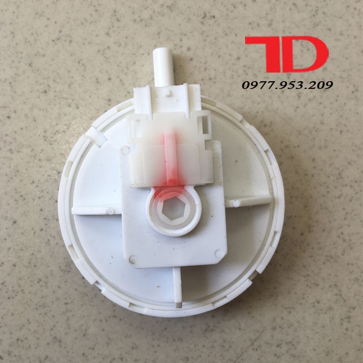 Van áp lực máy giặt (cảm biến mực nước) có chức năng cảm biến mức nước trong lồng giặt. Khi bật máy các bạn thấy máy giặt đảo mấy vòng rồi mới cấp nước vào, lúc này máy giặt đang cân trọng lượng quần áo của bạn để tính lượng nước cấp vào. Phao áp lực có tác dụng báo mức nước về cho board mạch xử lý chạy. Công tắc này làm việc thông với một ống dẫn nước bằng nhựa nối từ công tắc áp suất xuống bên hông phía ngoài lồng giặt, gần tới đáy lồng. Ống nhựa chứa không khí bên trong. Khi nước vào lồng giặt thì cũng vào ống nhựa. Khi nước dâng cao bên trong ống, nó sẽ đẩy hơi và gia tăng áp suất hơi trong ống. Khi áp suất hơi đạt đến một mức nhất định, thì nó sẽ mở công tắc áp suất.