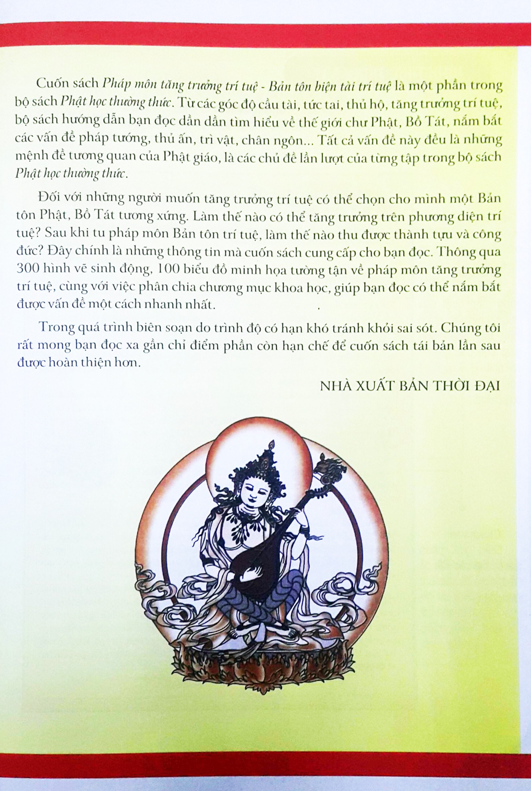 Đối với những người muốn tăng trưởng trí tuệ có thể chọn cho mình một Bản tôn Phật, Bồ Tát tương xứng. Làm thế nào có thể tăng trưởng trên phương diện trí tuệ? Sau khi tu pháp môn Bản tôn trí tuệ, làm thế nào thu được thành tựu và công đức? Đây chính là những thông tin mà cuốn sách cung cấp cho bạn đọc. Thông qua 300 hình vẽ sinh động, 100 biểu đồ minh họa tường tận về pháp môn tăng trưởng trí tuệ, cùng với việc phân chia chương mục khoa học, giúp bạn đọc có thể nắm bắt được vấn đề một cách nhanh nhất.