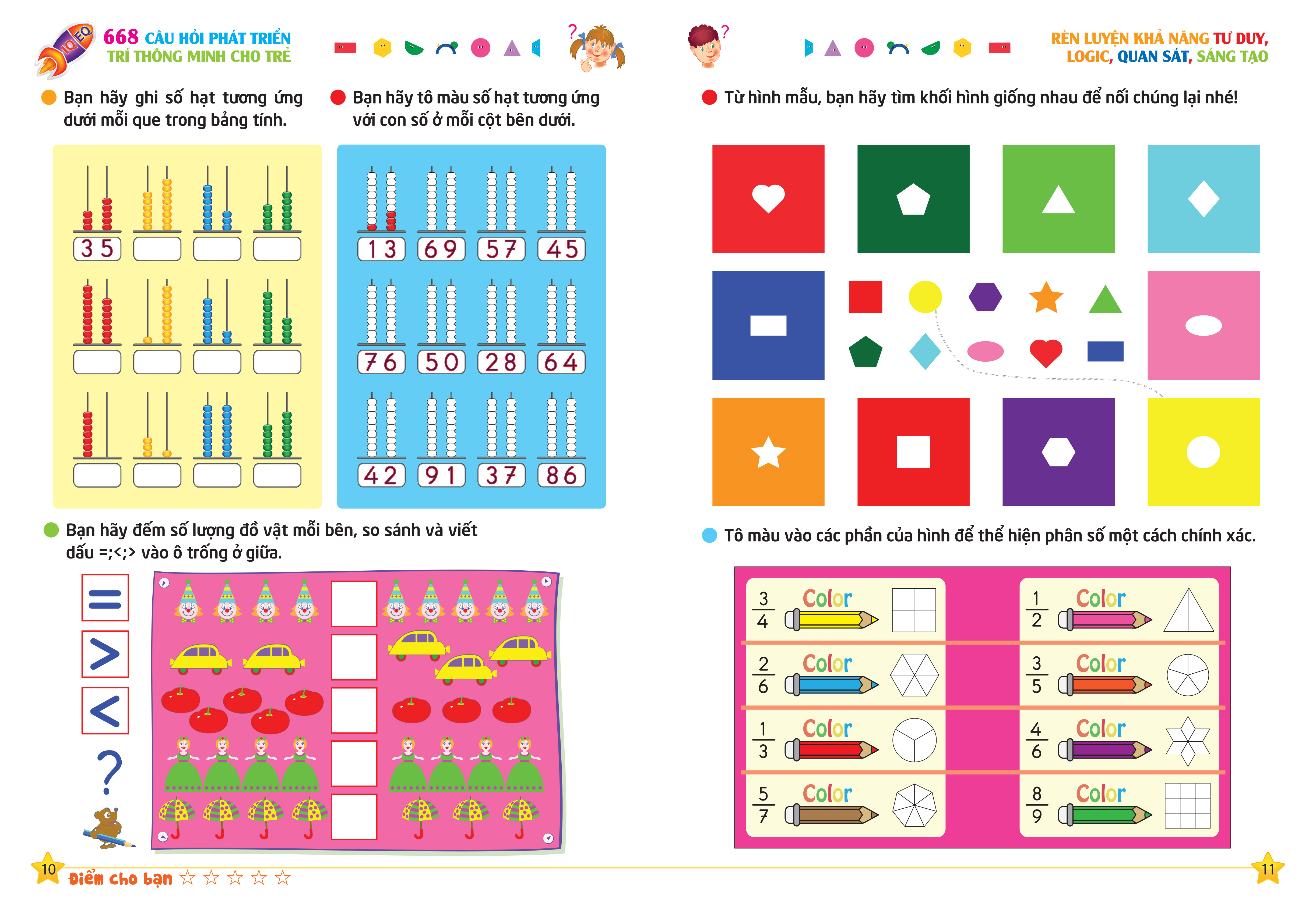 - Bộ Sách 668 Câu hỏi phát triển trí thông minh cho trẻ nhằm phát triển IQ,EQ, Cung cấp những trò chơi toán học úp trẻ phát huy tối đa khả năng nhận thức , tư duy phân kỳ , tưởng tượng, tri giác về không gian, phán đoán ,suy luận và thông minh cảm xúc giúp trẻ rèn luyện tư duy một cách toàn diện . Nhiều bài trong bộ sách được trang bị để có sự tương tác giữa bố mẹ và con cái , vừa nân cao năng lực tuy duy của mình vừa giúp trẻ phát triển các kỹ năng tư duy cần thiết để trẻ xây dựng kỹ năng , sự khéo léo , tính chính xác và rèn luyện độ kiên trì