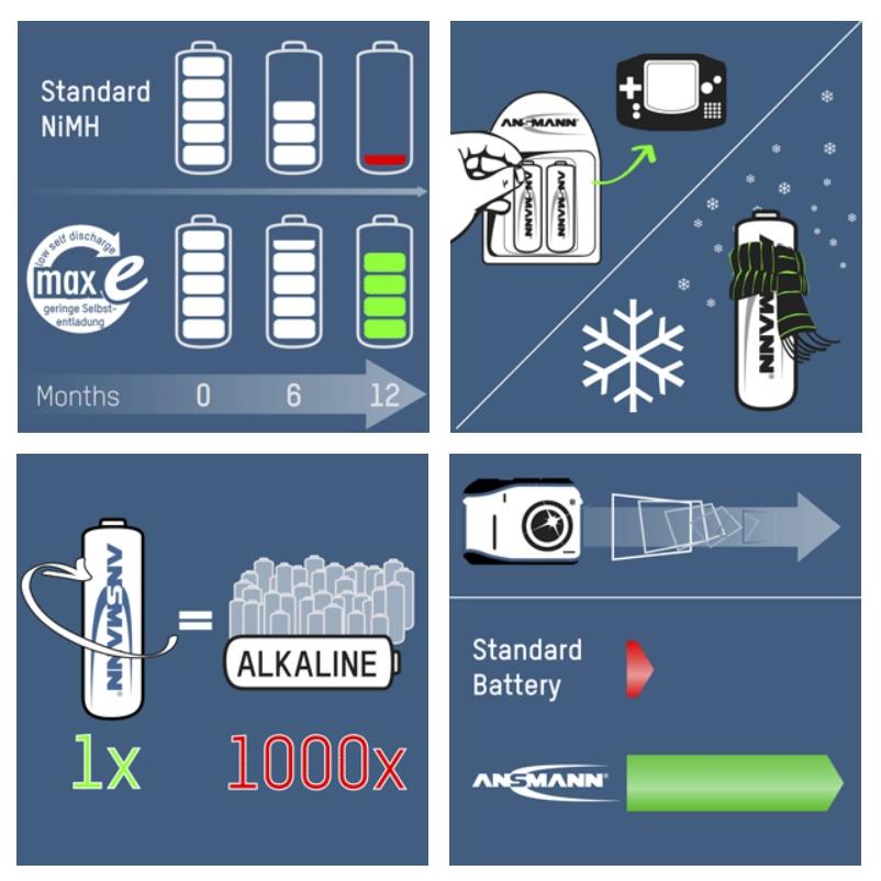Pin có tuổi thọ cao (trên 1000 lần sạc xả)và có thời gian chờ kéo dài với mức hao hụt năng lượng trong khoảng thời gian này là rất nhỏ. Độ tự xả cực thấp nhờ tích hợp công nghệ của Ansmann (Pin sạc đầy nếu không sử dụng sau một năm vẫn còn tới 80% dung lượng) . Chu kỳ sạc, xả rất ổn định, có hỗ trợ với dòng sạc cao (Sạc nhanh), hoạt động cực kì bền bỉ với khả năng sạc lại 1000 lần mà vẫn duy trì mức dung lượng thiết kế. Pin được thiết kế để hoạt động ở môi trường khắc nghiệt nhất (dưới 0 độ C Pin vẫn hoạt động bình thường).