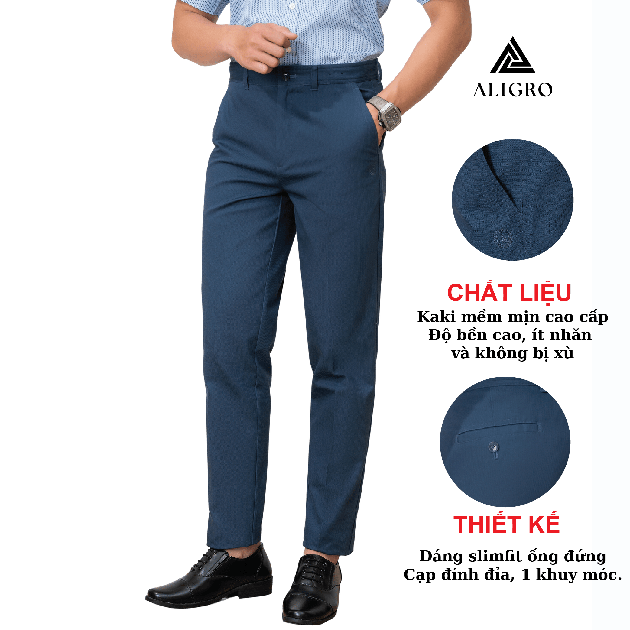 Mua tại TiktokGIỚI THIỆU THƯƠNG HIỆU Mang trong mình tầm nhìn chiến lược trở thành thương hiệu “Thời trang nam được yêu thích nhất Việt Nam” nên Aligro luôn chú trọng nghiên cứu phát triển mẫu mã, phom dáng phù hợp với vóc dáng hình thể đàn ông Việt. Sản phẩm của chúng tôi mang tới hình ảnh trẻ trung, năng động, hiện đại mà không kém phần lịch sự, sang trọng - cam kết mang lại giá trị đích thực và một cuộc sống thịnh vượng hơn cho phái mạnh Việt. CHI TIẾT THIẾT KẾ QUẦN KAKI NAM ALIGRO
