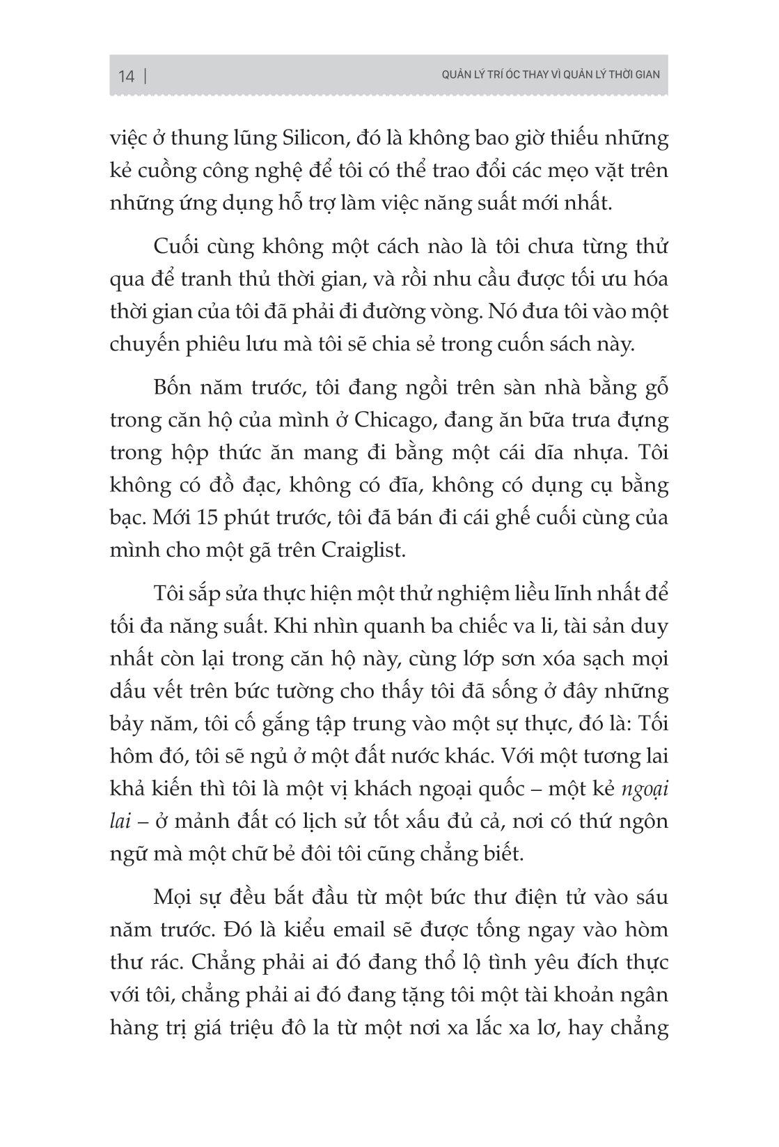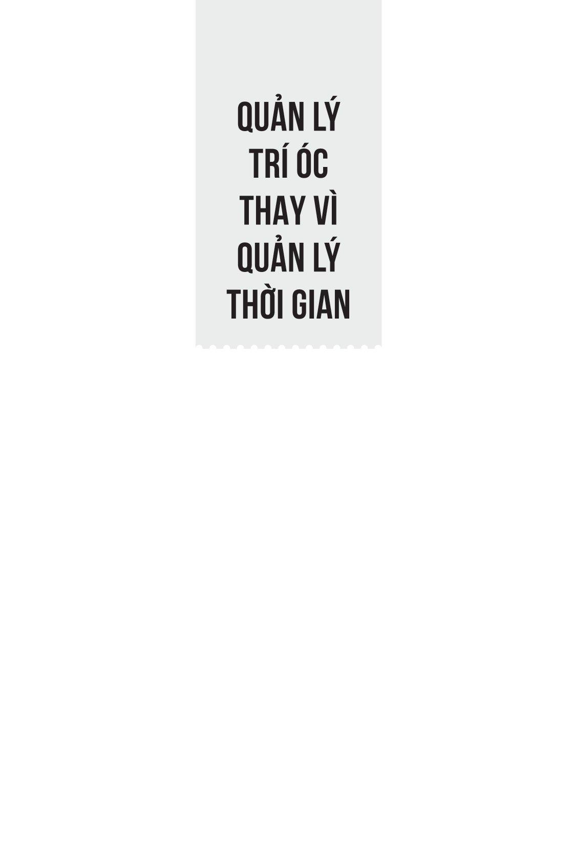 Nhiều khi chúng ta hành động cứ như thể không còn lựa chọn nào khác ngoài việc chèn thật chặt vào lịch làm việc, phải làm nhiều việc cùng lúc, và lúc nào cũng phải cập rập, vội vã. Bất cứ khi nào tìm được cơ hội để làm việc nhanh hơn, bớt phải chờ đợi hơn hoặc có thể “một mũi tên trúng hai đích" thì chúng ta cũng vồ lấy luôn. Chuyện này biến chúng ta thành những kẻ “sùng bái thời gian". Làm việc năng suất ngày nay không phải là chuyện quản lý thời gian, mà là quản lý tâm trí.