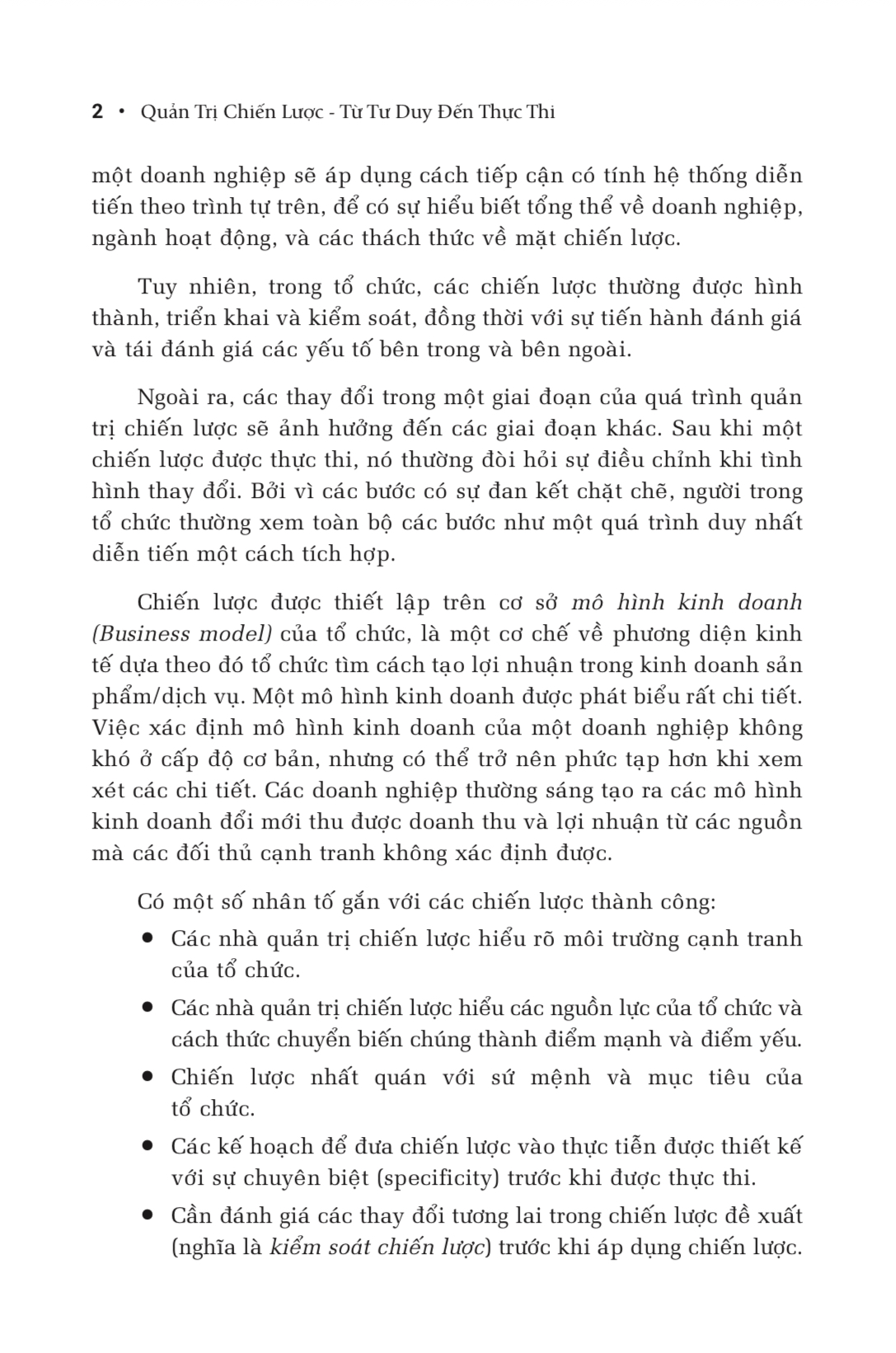Quản trị chiến lược chủ yếu là quản trị để đạt kết quả thành công kỳ vọng. Các nhiệm vụ chính của chiến lược là xác định các nguồn lực tạo thành quả kinh doanh xuất sắc, thiết kế và thực thi chiến lược để phát huy các nguồn lực đó. Tư duy về chiến lược kinh doanh đang thay đổi trong bối cảnh các tác lực tái định hình môi trường kinh doanh vĩ mô và tái cấu trúc các điểm mạnh và điểm yếu của doanh nghiệp. Môi trường kinh doanh toàn cầu xuất hiện liên tục các nhân tố mới như sự tái thiết kế các nguồn lực đầu vào, định vị thị trường đa quốc gia với các ưu tiên về tốc độ, phương thức, kỹ năng mềm, công nghệ hàm lượng tri thức, tái định hình ưu tiên của khách hàng, biến động về giá cả và tỷ giá hối đoái, các phương thức kinh doanh mới (e-commerce, teleconferencing, multi-level marketing, sử dụng Al...). Trong bối cảnh cạnh tranh và sự bất ổn cao, kết hợp với sự cải tiến liên tục, tinh thần khởi nghiệp cao, việc tạo lập lợi thế cạnh tranh động trở nên thiết yếu để tồn tại và phát triển. Có nhiều cấp độ chiến lược: • Chiến lược cấp công ty (Corporate - level Strategy): Mục đích chính là đạt các mục tiêu tài chính, quyết định phân bố cho các bộ phận (chi nhánh) nguồn lực như thế nào để phục vụ kế hoạch chiến lược • Chiến lược cấp kinh doanh (Business - level Strategy): Đáp ứng các công ty cạnh tranh trong ngành hoặc trong phân khúc mà các đơn vị kinh doanh chiến lược (strategic business unit - SBU) đang cạnh tranh, với các tác lực môi trường. Còn được gọi là "Chiến lược tổng thể - grand strategy, master strategy" để phân biệt với các chiến lược chức năng. • Chiến lược cấp chức năng (Functional - level Strategy) còn được gọi là các "Chương trình - programs", vì có đặc điểm tác nghiệp và nêu cụ thể công việc của các chức năng như R&D, Thiết kế, Sản xuất, Tài chính, Marketing, Nguồn nhân lực... sẽ thực hiện trong năm. Quản trị chiến lược gồm các giai đoạn: • Phát sinh tư duy chiến lược. • Phân tích chiến lược. • Quá trình hoạch định chiến lược: Các mục tiêu, tầm nhìn, chiến lược, mục tiêu, phát biểu giá trị, mô hình kinh doanh... • Hoạch định tác nghiệp: Gồm các kế hoạch, ngân sách, nhiệm vụ chi tiết của các đơn vị. • Thực thi chiến lược: Sự tham gia cam kết của toàn bộ các cấp quản trị và nhân viên. • Đánh giá và kiểm soát: Duy trì tổ chức theo đúng tuyến chiến lược, phát biểu giá trị, mô hình kinh doanh có thể điều chỉnh tùy theo tình huống. Quyển sách "Quản trị Chiến lược" này gồm các chương quan trọng sau: Chương 1: Tổng quan về Quản trị chiến lược (Overview of Strategic Management) Chương 2: Cạnh tranh trong ngành (Industry Competition) Chương 3: Mô hình hoạch định hhiến lược (Strategic Planning Models) Chương 4: Phân tích môi trường bên ngoài (External Analysis) Chương 5: Phân tích công ty (Company Analysis) Chương 6: Hoạch định và lựa chọn phương án chiến lược (Strategic Planning and Strategic Alternative Choice) Chương 7: Thực thi chiến lược (Strategic Implementation) Chương 8: Kiếm soát chiến lược (Strategic Control) Quyển sách giới thiệu các khái niệm, kiến thức cơ bản và nâng cao, các mô hình, các kỹ thuật phân tích, hoạch định, thực thi, kiểm soát hiệu quả các chiến lược, làm nền tảng để tạo lợi thế cạnh tranh khác biệt, được kỳ vọng sẽ hữu ích với các sinh viên đại học, học viên cao học, các giảng viên, các nhà nghiên cứu, các nhà quản trị...