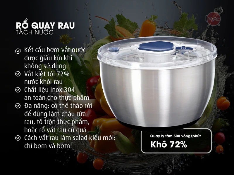 Với rổ quay rau iMat, mọi thứ đơn giản hơn nhiều: chỉ cần bơm – và bơm, bạn sẽ có ngay phần rau ráo nước tới 72% mà không cần dùng lực. Cơ chế bơm lực quay ly tâm tạo tốc độ lên đến 500 vòng/phút khi có rau (và tới 700 vòng/phút khi không tải), giúp đẩy nước ra khỏi bề mặt lá rau nhanh chóng, nhẹ nhàng mà vẫn giữ nguyên độ giòn và tươi của rau.