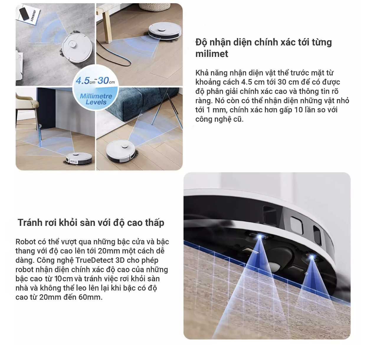 Tích hợp công nghệ Quét laser 3D định vị hệ thống hiển thị bản đồ toàn bộ ngôi nhà. Chốt quét: 2 chiếc Tự động quay về dock sạc, leo dốc 3cm. Thời gian sạc