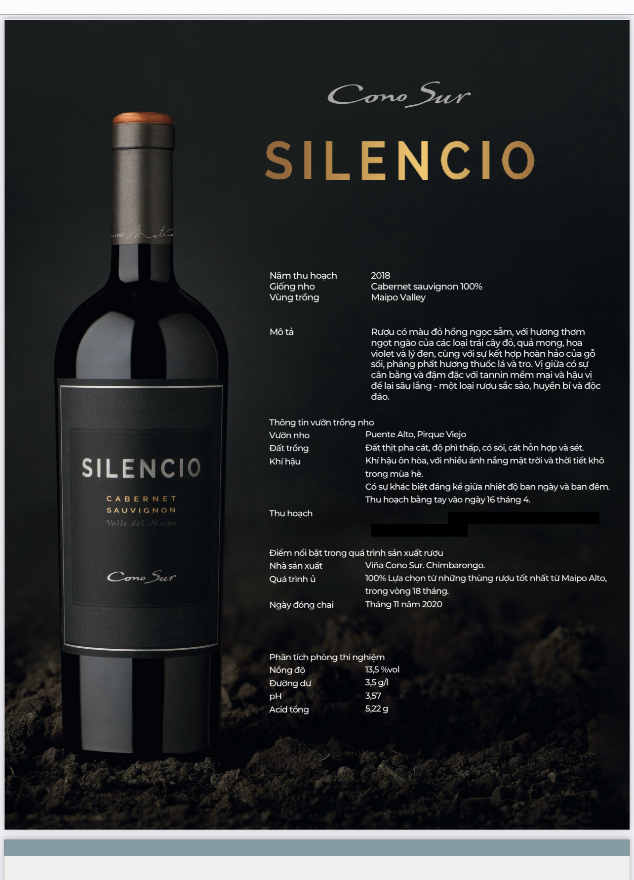 Vina Cono Sur Chile là nhà rượu top 11 thế giới và top 3 Chile thành lập năm 1993. Sở hữu hơn 3000 ha đất trồng nho ở các vùng sản xuất rượu vang nổi tiếng của Chile như: Aconcagua, Maipo, Casablanca và Colchagua.   Chỉ trong 5 năm đầu tiên tồn tại, rượu vang của Cono Sur đã đạt được hơn 150 huy chương và giải thưởng. Các sản phẩm đã được phân phối trên 100 quốc gia trên thế giới. Đạt được rất nhiều giải thưởng quốc tế. SILENCIO phiên bản giới hạn chỉ có 60 chai tại thị trường Việt Nam Năm thu hoạch: 2018 Giống nho: Cabernet sauvignon 100% Vùng trồng: Maipo Valley   Mô tả Rượu có màu đỏ hồng ngọc sẫm, với hương thơm ngọt ngào của các loại trái cây đỏ, quả mọng, hoa violet và lý đen, cùng với sự kết hợp hoàn hảo của gỗ sồi, phảng phất hương tro. Vị giữa có sự cân bằng và đậm đặc với tannin mềm mại và hậu vị để lại sâu lằng - một loại rượu sắc sảo, huyền bí và độc đáo. Thông tin vườn trồng nho: Vườn nho: Puente Alto, Pirque Viejo Đất trồng: Đất thịt pha cát, độ phì thấp, có sỏi, cát hỗn hợp và sét. Khí hậu: Khí hậu ôn hòa, với nhiều ánh năng mặt trời và thời tiết khô trong mùa hè. Có sự khác biệt đáng kể giữa nhiệt độ ban ngày và ban đêm. Thu hoạch: Thu hoạch bằng tay vào ngày 16 tháng 4.   Điểm nỗi bật trong quá trình sản xuất rượu Nhà sản xuất: Viña ConoSur Chimbarongo. Quá trình ủ: 100% Lựa chọn từ những thùng rượu tốt nhất từ Maipo Alto, trong vòng 18 tháng. Ngày đóng chai: Tháng 11 năm 2020 Phân tích phòng thí nghiệm Nồng độ: 13,5 %vol Đường dư: 3,5 g/l pH: 3,57 Acid tổng: 5,22g