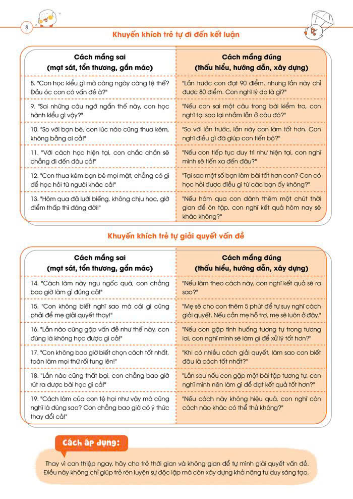 Kết hợp lý thuyết và thực hành: Không chỉ giải thích lý do mà còn có ví dụ thực tế, mẫu câu cụ thể giúp cha mẹ sử dụng ngay.