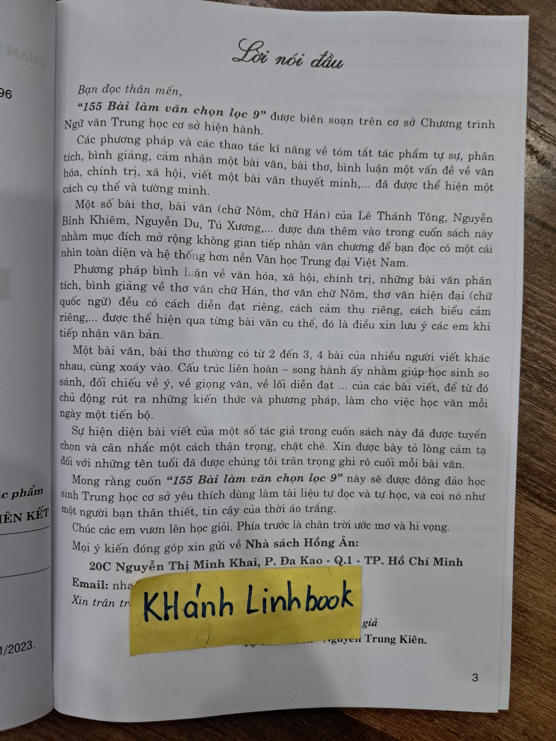 Sách - 155 bài làm văn chọn lọc 9 + ha Bạn đọc thân mến, “155 Bài làm văn chọn lọc 9” được biên soạn trên cơ sở Chương trình Ngữ văn Trung học cơ sở hiện hành Các phương pháp và các thao tác kĩ năng về tóm tắt tác phẩm tự sự, phân tích, bình giảng, cảm nhận một bài văn, bài thơ, bình luận một vấn đề về văn hóa, chính trị, xã hội, viết một bài văn thuyết minh, đã được thể hiện một cách cụ thể và tường minh. Một số bài thơ, bài văn (chữ Nôm, chữ Hán) của Lê Thánh Tông, Nguyễn Bỉnh Khiêm, Nguyễn Du, Tú Xương, được đưa thêm vào trong cuốn sách này nhằm mục đích mở rộng không gian tiếp nhận văn chương để bạn đọc có một cái nhìn toàn diện và hệ thống hơn nền Văn học Trung đại Việt Nam. Phương pháp bình luận về văn hóa, xã hội, chính trị, những bài văn phân tích, bình giảng về thơ văn chữ Hán, thơ văn chữ Nôm, thơ văn hiện đại (chữ quốc ngữ) đều có cách diễn đạt riêng, cách cảm thụ riêng, cách biểu cảm riêng, được thể hiện qua từng bài văn cụ thể, đó là điều xin lưu ý các em khi tiếp nhận văn bản. Một bài văn, bài thơ thường có từ 2 đến 3, 4 bài của nhiều người viết khác nhau, cùng xoáy vào. Cấu trúc liên hoàn - song hành ấy nhằm giúp học sinh so sánh, đối chiếu về ý, về giọng văn, về lối diễn đạt của các bài viết, để từ đó chủ động rút ra những kiến thức và phương pháp, làm cho việc học văn mỗi ngày một tiến bộ. Sự hiện diện bài viết của một số tác giả trong cuốn sách này đã được tuyển chọn và cân nhắc một cách thận trọng, chặt chẽ. Xin được bày tỏ lòng cảm tạ đối với những tên tuổi đã được chúng tôi trân trọng ghi rõ cuối mỗi bài văn. Mong rằng cuốn “155 Bài làm văn chọn lọc 9” này sẽ được đông đảo học sinh Trung học cơ sở yêu thích dùng làm tài liệu tự đọc và tự học, và coi nó như một người bạn thân thiết, tin cậy của thời áo trắng. Chúc các em vươn lên học giỏi. Phía trước là chân trời ước mơ và hi vọng.
