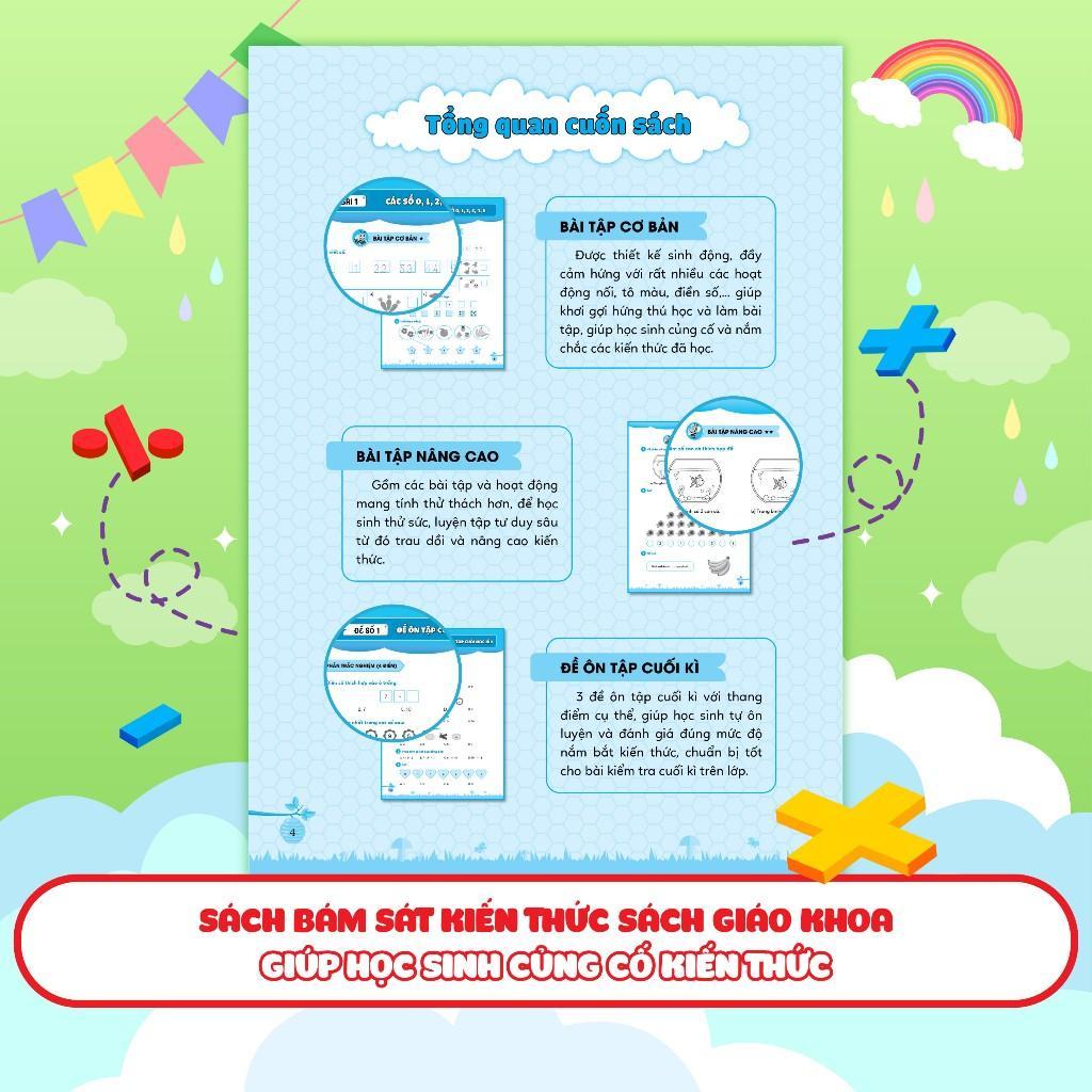 Các bài tập trong phần này được thiết kế sinh động, đầy cảm hứng với rất nhiều các hoạt động nối, tô màu, điền số,... giúp khơi gợi hứng thú học và làm bài tập của các em, đồng thời giúp các em củng cố và nắm chắc các kiến thức đã học.