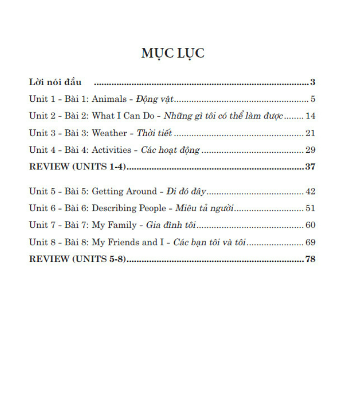 Các em học sinh thân mến! Cuốn sách “Bài tập tiếng Anh 4” được biên soạn dựa theo SGK Tiếng Anh 4 i-learn Smart Start nhằm mục đích giúp các em có thêm tài liệu để luyện tập môn Tiếng Anh lớp 4. Sách bao gồm nhiều bài tập về từ vựng, ngữ pháp và ngữ âm mà các em đã học trong chương trình ở trường. Các bài tập được thiết kế khá đa dạng theo các chủ điểm để các em có thể luyện tập và ghi nhớ các từ vựng mới, các mẫu câu đối thoại cơ bản và các âm chữ cái. Lưu ý trước khi làm bài tập, các em nên xem qua phần từ vựng và ngữ pháp ở đầu mỗi bài. Phần này không những chú thích ý nghĩa của từng từ vựng mà còn giảng giải chi tiết cách dùng từng mẫu câu. Điều này sẽ giúp các em làm tốt tất cả các bài tập trong sách. Hy vọng cuốn sách này sẽ là một tài liệu hữu ích cho các em trong việc học tập và rèn luyện môn Tiếng Anh lớp 4, giúp các em ngày càng tiến bộ và tự tin hơn với khả năng tiếng Anh của mình. Mặc dù tác giả đã có nhiều cố gắng trong việc biên soạn, song cuốn sách không thể tránh khỏi một số thiếu sót ngoài ý muốn. Chúng tôi rất mong nhận được những ý kiến đóng góp quý báu từ các bạn đồng nghiệp và các em học sinh để cuốn sách hoàn thiện hơn trong lần tái bản sau. Chúc các em thành công!