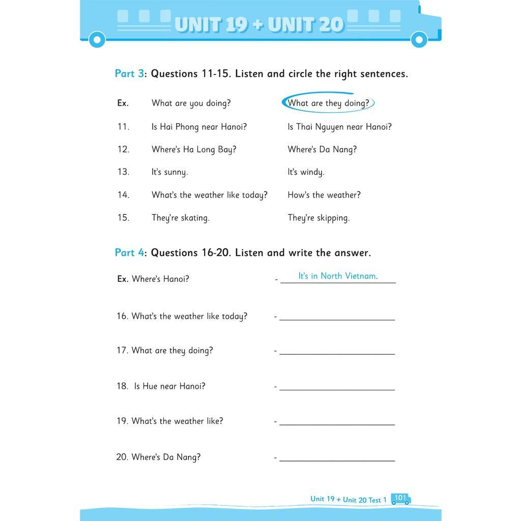 Cứ hai bài sẽ có 2 bài kiểm tra, tất cả các bài kiểm tra đều được thiết kế theo quy định thông tư mới nhất về kiểm tra môn Tiếng Anh tiểu học.