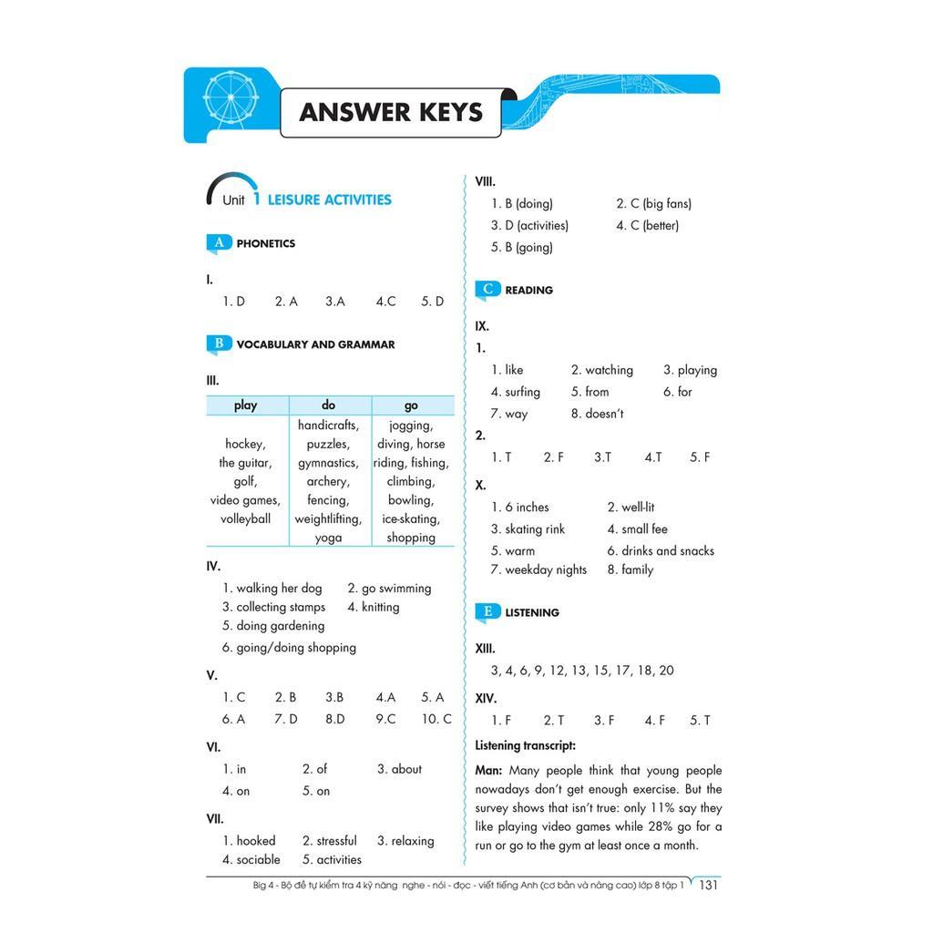 Big 4 Bộ Đề Tự Kiểm Tra 4 Kỹ Năng Nghe – Nói – Đọc – Viết (Cơ Bản và Nâng Cao) Tiếng Anh Lớp 8 Tập 1 viết theo chuẩn khung chương trình mới của Bộ Giáo Dục và Đào Tạo giúp các em học sinh lớp 8 củng cố và phát triển toàn diện các kỹ năng: Nghe – Nói – Đọc – Viết Tiếng Anh.