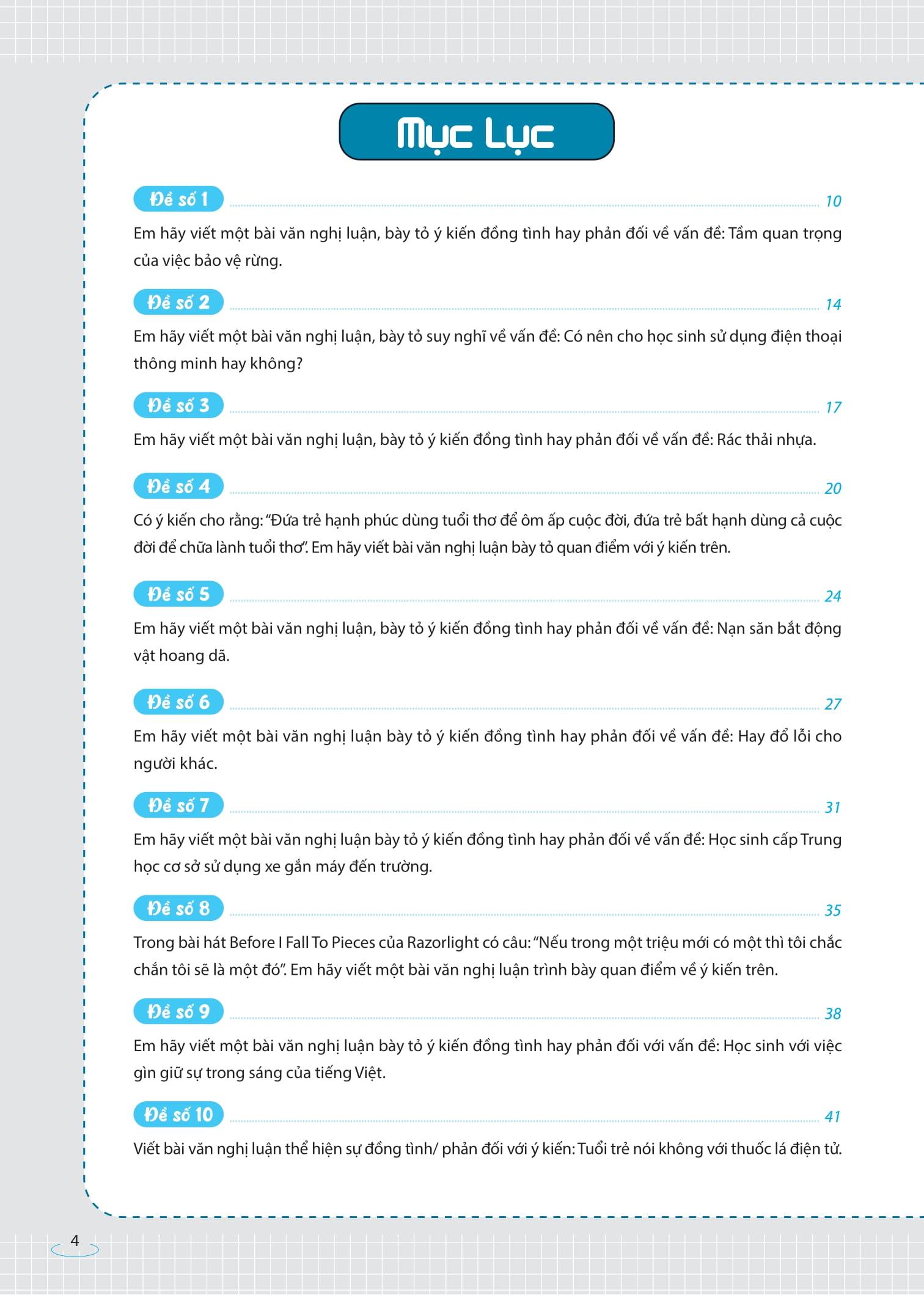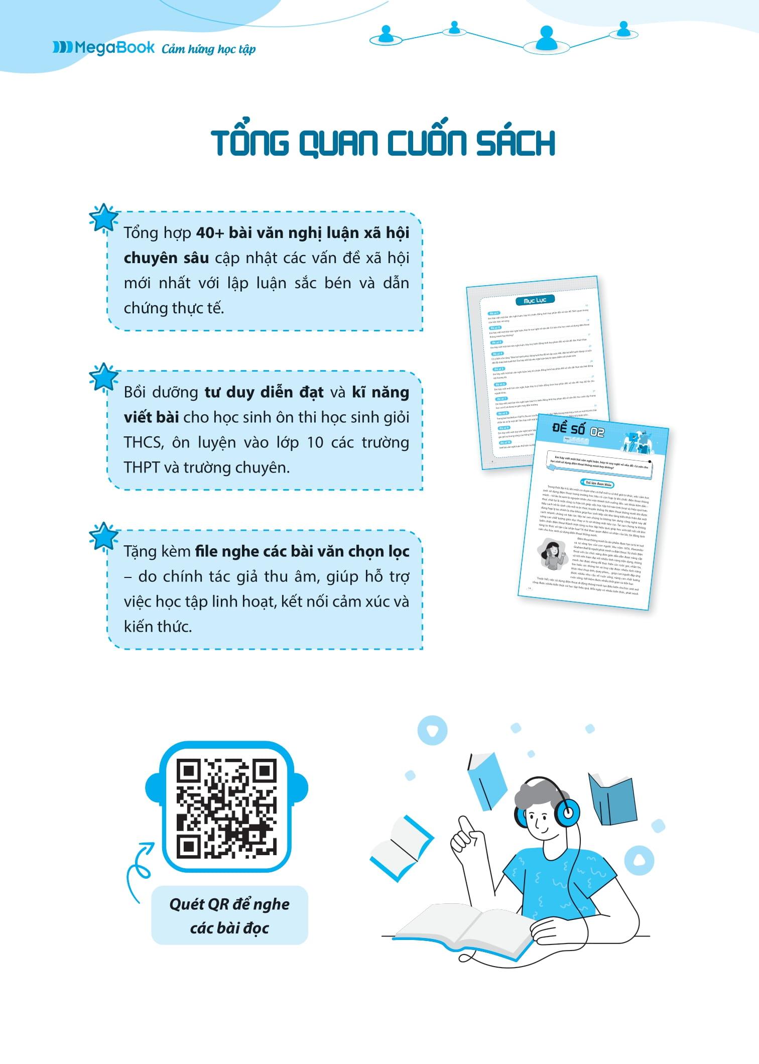 - Bố cục khoa học, nâng cao tư duy theo lộ trình: Các bài văn được sắp xếp từ chủ đề cơ bản đến chuyên sâu, từ đơn giản đến phức tạp, giúp học sinh từng bước làm quen và nâng cao kỹ năng viết bài nghị luận xã hội một cách có hệ thống.