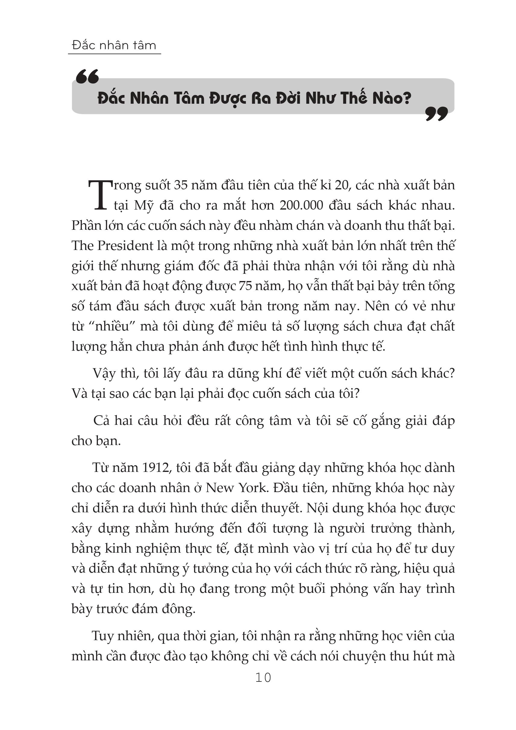 - ĐẮC NHÂN TÂM Nếu bạn còn lúng túng mỗi khi trò chuyện thì cuốn sách Đắc Nhân Tâm của tác giả Dale Carnegie chính là những gì bạn cần. Mỗi trang sách đúc kết kinh nghiệm từ bậc thầy giao tiếp sẽ mở ra những góc nhìn thú vị về tâm lý - hành vi của con người dưới tác động của ngôn từ. Các nguyên tắc trong đây sẽ là chìa khoá giúp cho cuộc sống của bạn trở nên hạnh phúc, thành công hơn. Đây là quyển sách duy nhất về thể loại self-help liên tục đứng đầu danh mục sách bán chạy nhất (best-selling Books) do báo The New York Times bình chọn suốt 10 năm liền và đã được dịch ra hơn 50 ngôn ngữ khác nhau Riêng bản tiếng Anh của sách đã bán được hơn 15 triệu bản trên thế giới. Tác phẩm có sức lan toả vô cùng rộng lớn - dù bạn đi đến bất cứ đâu, bất kỳ quốc gia nào cũng đều có thể nhìn thấy. Tác phẩm được đánh giá là quyển sách đầu tiên và hay nhất, có ảnh hưởng làm thay đổi cuộc đời của hàng triệu người trên thế giới. Đắc nhân tâm và cái Tài trong mỗi người chúng ta. Đắc Nhân Tâm trong ý nghĩa đó cần được thụ đắc bằng sự hiểu rõ bản thân, thành thật với chính mình, hiểu biết và quan tâm đến những người xung quanh để nhìn ra và khơi gợi những tiềm năng ẩn khuất nơi họ, giúp họ phát triển lên một tầm cao mới. Đây chính là nghệ thuật cao nhất về con người và chính là ý nghĩa sâu sắc nhất đúc kết từ những nguyên tắc vàng của Dale Carnegie.