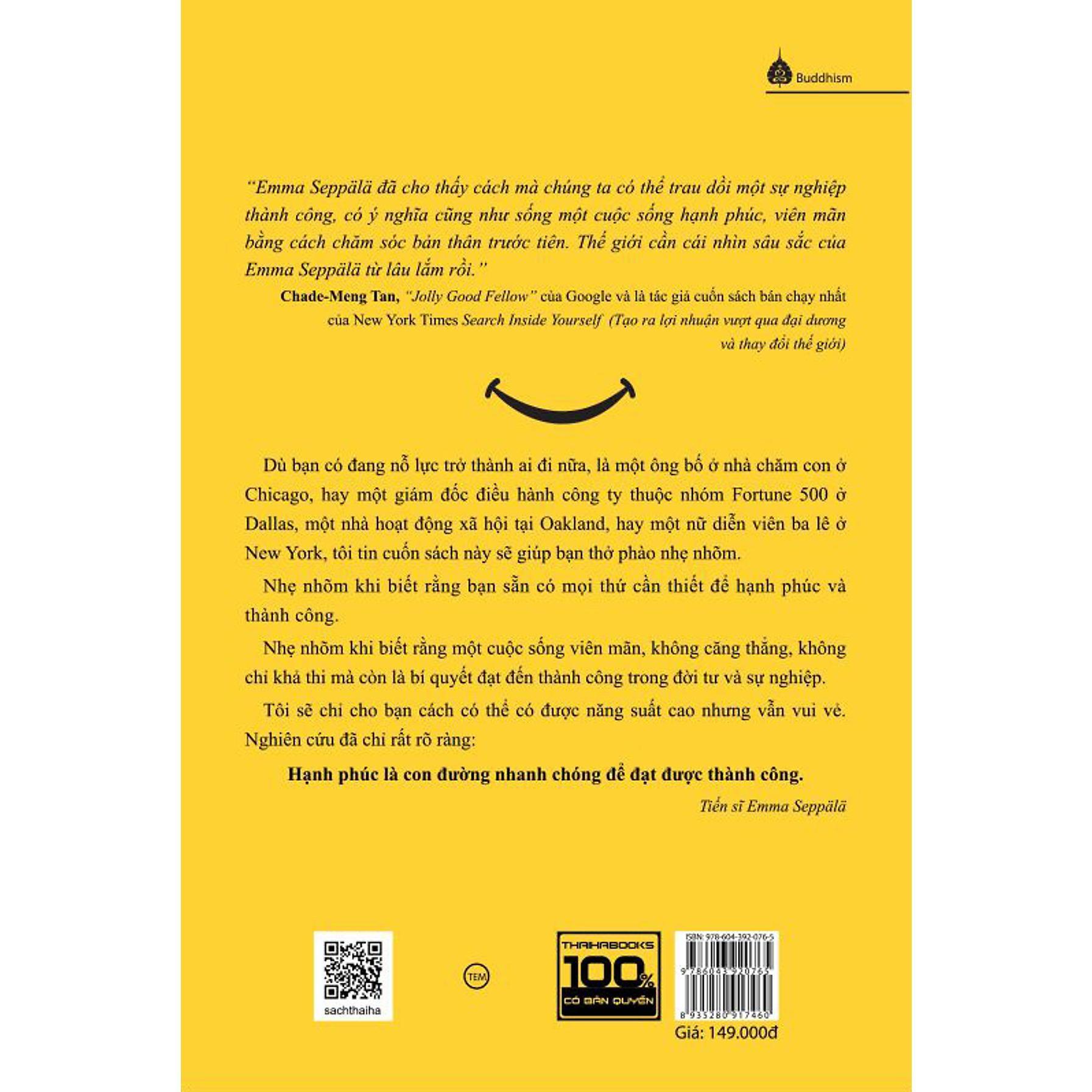 Dịch giả Đồng Khôi dịch – Anh Nhơn hiệu đính Giá 149.000 VNĐ Số trang 320 trang Nhà xuất bản Thế giới Khổ 14 x 20.5 cm Barcode - ISBN 89352817460 ISBN: 978-6-392-6-5 Trọng lượng 250 grams CON ĐƯỜNG ĐẾN HẠNH PHÚC Tiến sĩ Emma Seppälä Đồng Khôi dịch – Anh Nhơn hiệu đính Hạnh phúc sẽ đem lại thành công. Tác giả mong muốn chỉ cho bạn chính xác cách mà hạnh phúc có thể giúp bạn phát huy tối đa khả năng hồi phục, năng lực sáng tạo, hiệu suất làm việc, sức hút cá nhân và nhiều kỹ năng quan trọng khác để đạt đến thành công. Bạn sẽ học được những kỹ năng như: làm thế nào để làm việc hiệu quả mà không bị chứng căng thẳng kinh niên, làm thế nào để đạt nhiều thành tích hơn mà không phải vắt kiệt sức; nói cách khác, làm thế nào để phát huy tiềm năng nghề nghiệp và thấy mãn nguyện về bản thân đến mức cao nhất. CON ĐƯỜNG ĐẾN HẠNH PHÚC: Cách áp dụng khoa học về hạnh phúc để đưa đến thành công nằm trong Dự ánPhật Học Tinh Hoa Thế Giới, dự án tuyển chọn dịch các tác phẩm hàn lâm và cập nhật từ các chuyên gia Phật học hàng đầu nhân loại tại các đại học tốt nhất thế giới: Oxford, Cambridge, Harvard, Columbia, Yale, Princeton, Chicago, Berkeley, Stanford... với mong muốn truyền tải tri thức Phật giáo tiếng Anh sang tiếng Việt đến đông đảo bạn đọc để làm tài liệu nghiên cứu Phật giáo, tôn giáo chuyên sâu. Tác giả: Tác giả: Tiến sĩ Emma Seppälä Cử nhân về Văn học so sánh tại Đại học Yale, Thạc sĩ về Ngôn ngữ và Văn hóa Đông Á tại Đại học Columbia và Tiến sĩ Tâm lý học tại Đại học Stanford. Giám đốc Khoa học của Trung tâm Nghiên cứu & Giáo dục Lòng nhân ái và vị tha tại Đại học Stanford. Nghiên cứu và giảng dạy tại Đại học Yale. Lĩnh vực nghiên cứu: Khoa học về Hạnh phúc, Trí tuệ Cảm xúc, Kết nối Xã hội. Những lời khen tặng “Con đường đến hạnh phúc cung cấp cho chúng ta cái nhìn tổng quan tuyệt vời về điều mà các nghiên cứu khoa học mới nhất đã khẳng định, đó là những cách quan trọng nhất để chúng ta tạo ra sức khỏe và hạnh phúc trong cuộc sống. Emma Seppälä là người tiên phong trong những hiểu biết và phương pháp thực hành cậpnhật và quan trọng có thể giúp chúng ta định nghĩa lại thành công. Cô đã giúp làm sáng tỏ cách mà lòng trắc ẩn trở thành nền tảng của một cuộc sống ý nghĩa và kết nối đối với bản thân và người khác. Thật là một món quà khi có thể tiếp thu những lời nói khôn ngoan của cô ấy và trau dồi những cách sâu sắc hơn để tất cả chúng ta có thể phát triển!” — Daniel J. Siegel, M.D., tác giả cuốn Mindsight, Brainstorm, and The Mindful Therapist (tạm dịch: Nhận thức tư duy, động não và nhà trị liệu chánh niệm), Giám đốc điều hành của Mindsight Institute (Trung tâm Nghiên cứu Tâm trí Sáng tạo), và Giáo sư lâm sàng tại Trường Y Khoa UCLA “Tiến sĩ Seppälä đã biến khoa học tiên tiến thành một cuốn sách thực tế, cấp tiến với những ảnh hưởng sâu sắc. Điều đáng chú ý là cảm giác hạnh phúc tốt cho sức khỏe, cho các mối quan hệ và cho công việc của chúng ta. Dựa trên nghiên cứu về khoa học thần kinh và tâm lý học, cũng như công trình mang tính đột phá của chính cô tại Stanford, Seppälä đã cho chúng ta sáu cách hiệu quả để biến hạnh phúc thành thành tựu lớn hơn.”