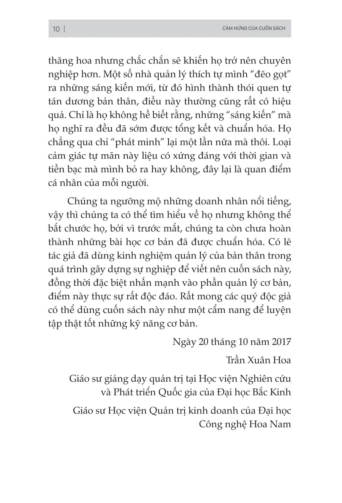 Đánh Thức Con Người Lãnh Đạo Bên Trong Bạn Làm quản lý, không thể tách rời các chức năng như lập kế hoạch, tổ chức, chỉ đạo, phối hợp và kiểm soát. Quản lý không hề phức tạp, nếu có thể làm tốt mấy việc cơ bản này thì bạn chính là bậc thầy. Mọi người thì lại thường thích nói về những bước chấm phá đáng ngưỡng mộ của các bậc thầy trong nghề, lâu dần nó sẽ khiến con người ta xem nhẹ những công việc cơ bản mà bền vững kia. Nhưng bạn phải biết rằng, có rất nhiều doanh nghiệp chỉ vì không làm đến nơi đến chốn những điều cơ bản này mà đã gây tổn hại đến sự nghiệp của cả đoàn đội, nhận về những tổn thất vô cùng to lớn. Cho dù là những doanh nghiệp đang đứng ở đỉnh cao, cũng rất dễ dàng sụp đổ. Xoay quanh chức năng của quản lý, cuốn sách Đánh thức con người lãnh đạo bên trong bạn cung cấp rất nhiều các công cụ đã được chuẩn hóa để có thể học hỏi và tham khảo, ví dụ như làm thế nào để tiến hành quản lý có mục tiêu; làm thế nào để giao lưu, kết nối trong nhóm; làm thế nào để lắng nghe. Mặc dù phần giới thiệu chưa được hoàn chỉnh và hệ thống hóa đầy đủ nhưng cũng có thể mang lại sự trợ giúp thiết thực. Giải quyết 1001 vấn đề quản lý! Chương 1: 80% Các nhà quản lý đạt 80 điểm Chương 2: Xác định rõ vị trí của nhân viên, không nên vơ hết việc vào người Chương 3: Xây dựng tổ chức giống một cuộc chơi, khiến công việc trở nên thú vị hơn Chương 4: Làm rõ các mối quan hệ, xây dựng một tập thể đoàn kết Chương 5: Dùng mục tiêu để quản lý con người, không dùng người để quản lý người Chương 6: Sử dụng cửa sổ giao tiếp để cải thiện khả năng giao tiếp của mỗi người Chương 7: Học cách lắng nghe và mở ra một kênh giao tiếp hữu ích. Chương 8: Đưa ra phản hồi kịp thời để nhân viên tôn trọng và tin tưởng bạn Chương 9: Sử dụng thời gian có hiệu quả, từ chối những nỗ lực không có hiệu quả. Bên cạnh đó, một phần quan trọng không thể thiếu của cuốn sách là các chia sẻ về tư duy khởi nghiệp và xây dựng thương hiệu cá nhân trong thời đại số. Không chỉ dừng lại ở việc áp dụng công nghệ, tư duy này còn yêu cầu mỗi nhà khởi nghiệp phải linh hoạt, sáng tạo và sẵn sàng đối mặt với sự thay đổi đang diễn ra rất nhanh chóng. Trong một thế giới mà sự bất định và biến động trở thành điều bình thường mới, khả năng thích ứng và đổi mới sẽ là chìa khóa dẫn đến thành công CUỐN SÁCH DÀNH CHO AI? Các nhà quản lý thiếu kinh nghiệm lãnh đạo: Những người mới thăng chức hoặc nhận vai trò lãnh đạo nhưng chưa biết cách xây dựng chiến lược, quản lý đội ngũ, hoặc ra quyết định hiệu quả. Những nhà sáng lập startup: Đối tượng đang vật lộn với việc định hướng, quản lý tài chính, và phát triển đội ngũ trong môi trường cạnh tranh khốc liệt. Các lãnh đạo bị mắc kẹt trong công việc thường ngày: Những người dành phần lớn thời gian xử lý sự cố, không thể tập trung vào tầm nhìn dài hạn hoặc cải thiện hiệu suất tổng thể. Những người đang điều hành doanh nghiệp có dấu hiệu trì trệ: Các lãnh đạo nhận thấy đội ngũ giảm động lực, hiệu suất kém, hoặc doanh nghiệp đang đứng trước nguy cơ sụp đổ nhưng không tìm ra nguyên nhân. Những người mới bắt đầu xây dựng sự nghiệp lãnh đạo: Đối tượng trẻ, đầy nhiệt huyết nhưng chưa có đủ kinh nghiệm hoặc hiểu biết để quản lý một tổ chức hoặc dự án một cách bài bản. AI CŨNG CÓ NĂNG LỰC LÃNH ĐẠO Năng lực lãnh đạo thực sự không phải là tài năng bẩm sinh của bất kỳ ai, cũng không phải là một loại nghệ thuật khó hiểu mà là một loại năng lực mà mỗi người đều có thể nắm giữ. Về bản chất, nó tương tự như chúng ta đang học những bộ môn như toán hay văn mà thôi. 4 bước rèn luyện quan trọng để cải thiện năng lực lãnh đạo Một nhân viên bình thường phải làm cách nào để có thể sở hữu được năng lực lãnh đạo? Muốn cải thiện năng lực lãnh đạo cũng như vậy, bạn cần một quá trình rèn luyện từng bước theo thứ tự. 01: Thiết lập lòng tin: Muốn trở thành ông chủ, bạn phải có phong thái của một ông chủ, hãy ý thức về việc bản thân cần trở thành một nhà quản lý ưu tú 02: Thành lập đội nhóm: Nếu người quản lý luôn quản lý nhóm theo ý m.ình thì cả nhóm sẽ sinh ra cảm giác ỷ lại. Bạn nên học cách buông tay, để nhóm tự phát triển. 03: Thiết lập hệ thống: Hệ thống giống như một bộ máy vận hành chính xác, một khi được thiết lập một cách chính xác sẽ vận hành trơn tru, không dừng lại vì bất cứ cá nhân nào. 04: Thiết lập văn hóa: Văn hóa doanh nghiệp trở thành biểu tượng cho phong cách nói chuyện của các doanh nhân. Nếu không để tâm vào xây dựng văn hóa, không tạo được nét đặc trưng cho doanh nghiệp, đến lúc đó, nói chuyện cũng mất tự nhiên! Khi m