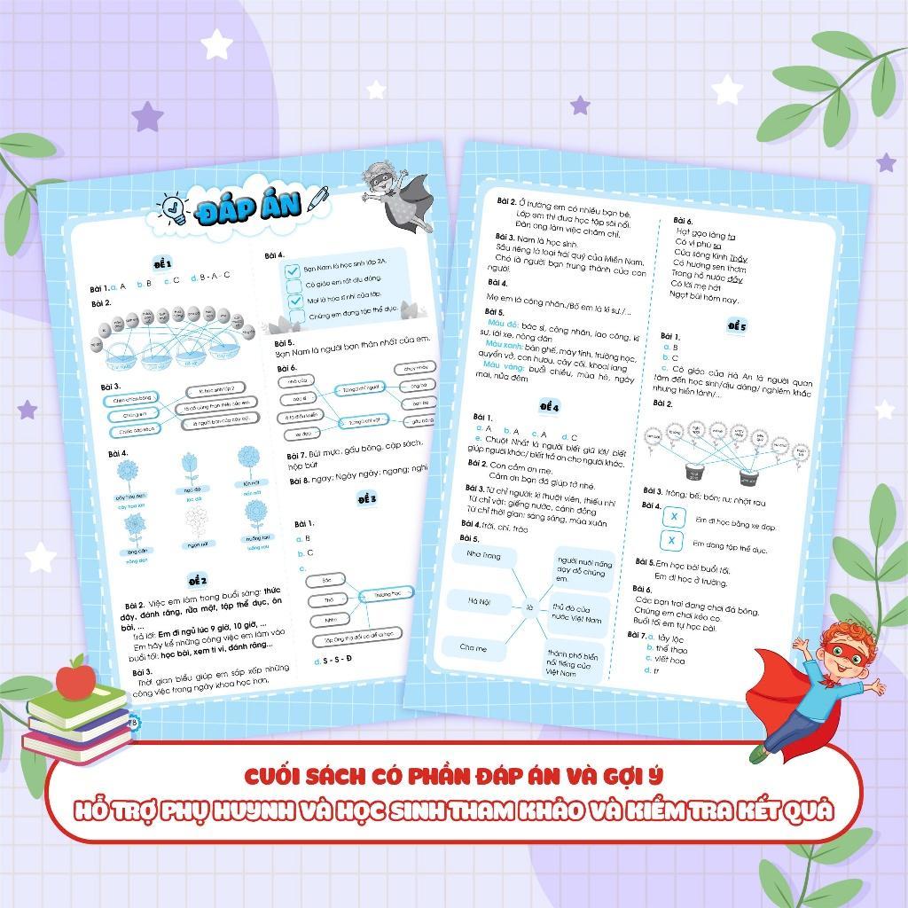 - Sách được chia thành 2 phần rất dễ hiểu cho các bé: Phần đề ôn tập và Phần đề kiểm tra. Phần đề ôn tập: Gồm 15 đề được chia theo các chủ điểm, hoặc chia thành các đề ôn tập theo sát chương trình học trên lớp theo giai đoạn. Phần đề kiểm tra: Gồm 5 đề kiểm tra cuối học kỳ để kiểm tra, đánh giá kiến thức tổng hợp của học sinh.