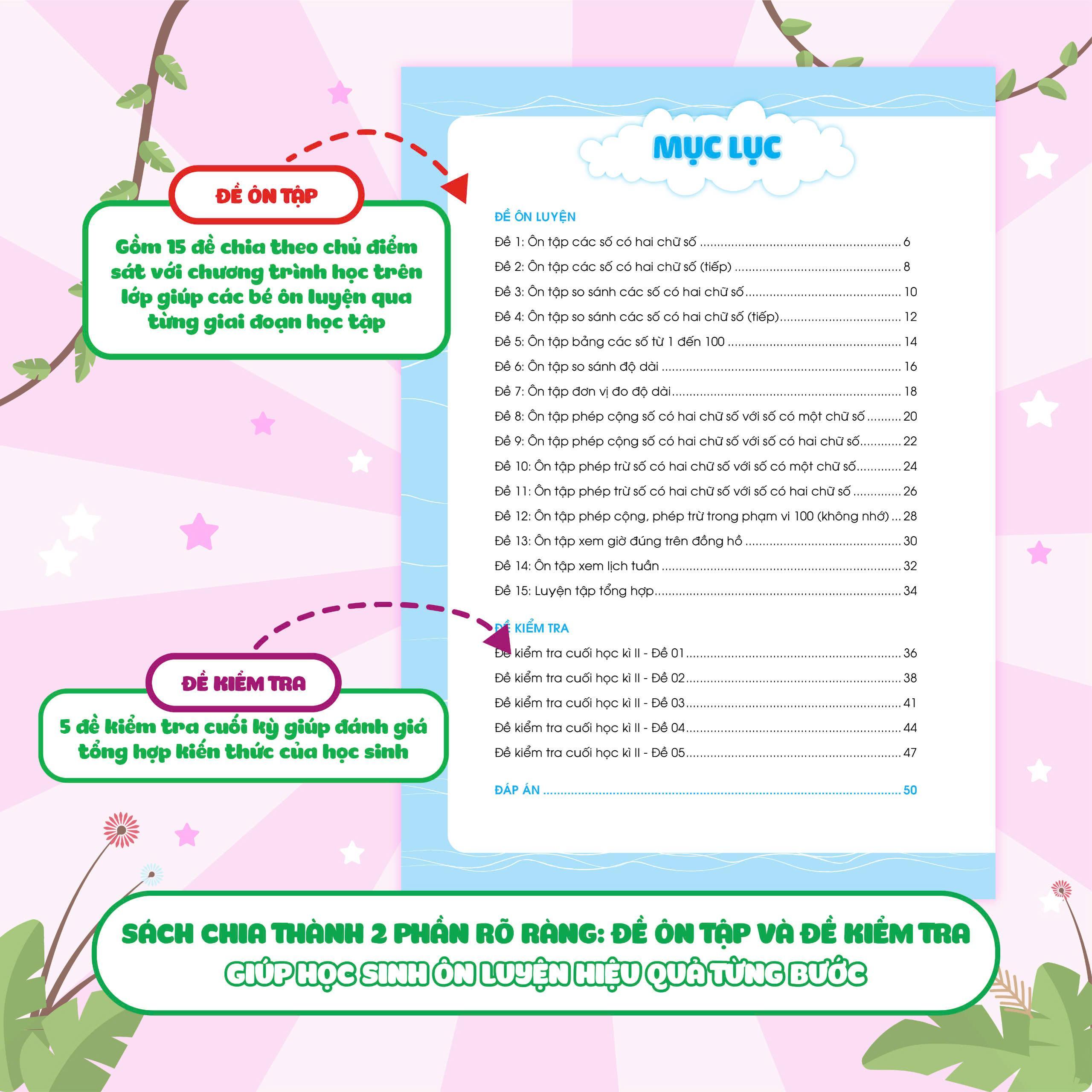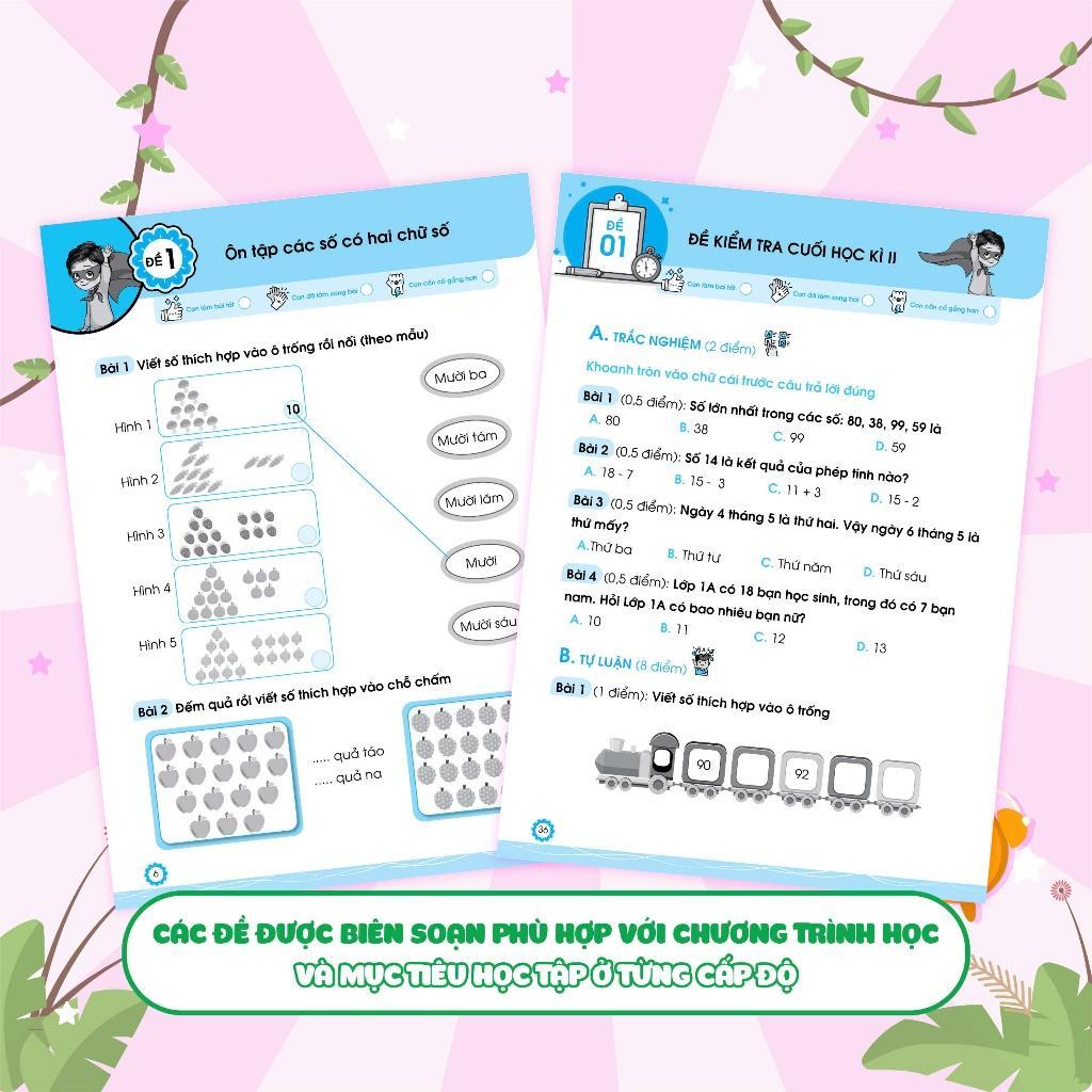 Đề ôn luyện và tự kiểm tra Toán lớp 1 tập 2 là một "trợ thủ" đắc lực giúp các em học sinh có thể tự ôn luyện sau mỗi giai đoạn học tập: ôn tập ngắn sau 2-3 tuần học, ôn tập giữa học kỳ và ôn tập cuối học kỳ - cuối năm học.
