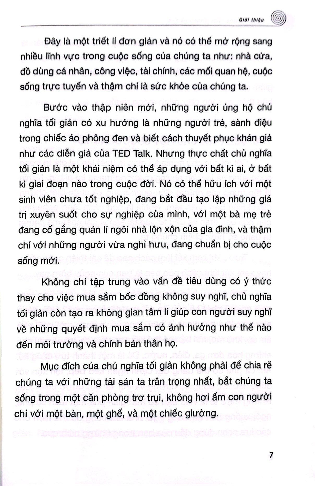 Lối sống tối giản có ý nghĩa nhiều hơn là việc chỉ đơn thuần dọn dẹp bớt đồ đạc dư thừa. Cuốn sách được tác giả chấp bút với mục đích giúp các độc giả trân trọng và biết ơn nhiều hơn những điều m.ình đang có, tìm thấy sự giàu có và giá trị của cuộc sống sau khi bạn dọn dẹp cả không gian sống lẫn tâm trí m.ình để dành chỗ cho sự thỏa mãn, mục đích sống và niềm vui. Khi bạn loại bỏ tất cả những vật dụng không hữu ích, những thói quen và tư duy không mang lại giá trị nào trong cuộc sống, thì đó là lúc bạn có thêm không gian và tâm trí để kết nối với những điều phù hợp với những giá trị và mục tiêu của riêng bạn. Tối giản là chìa khóa giúp chúng ta có những lựa chọn có ý nghĩa, qua đó có thể kiểm soát cuộc sống một cách ý thức hơn.
