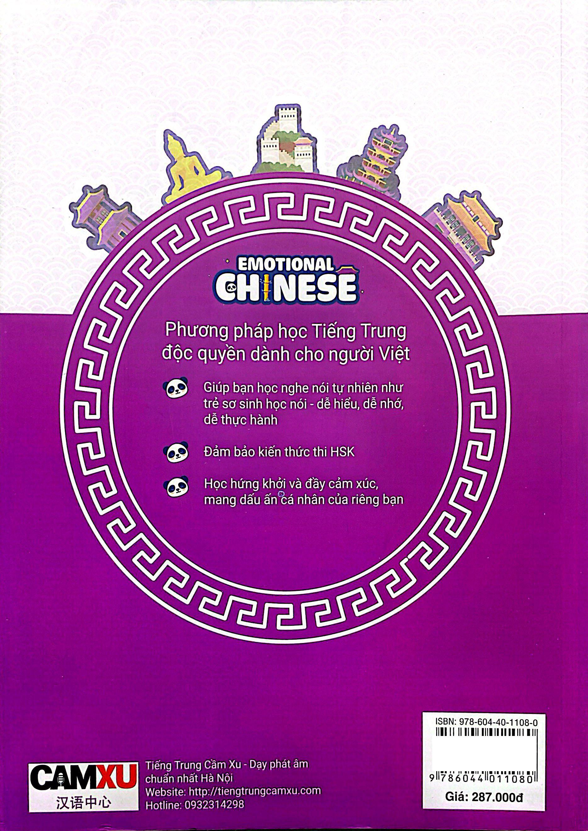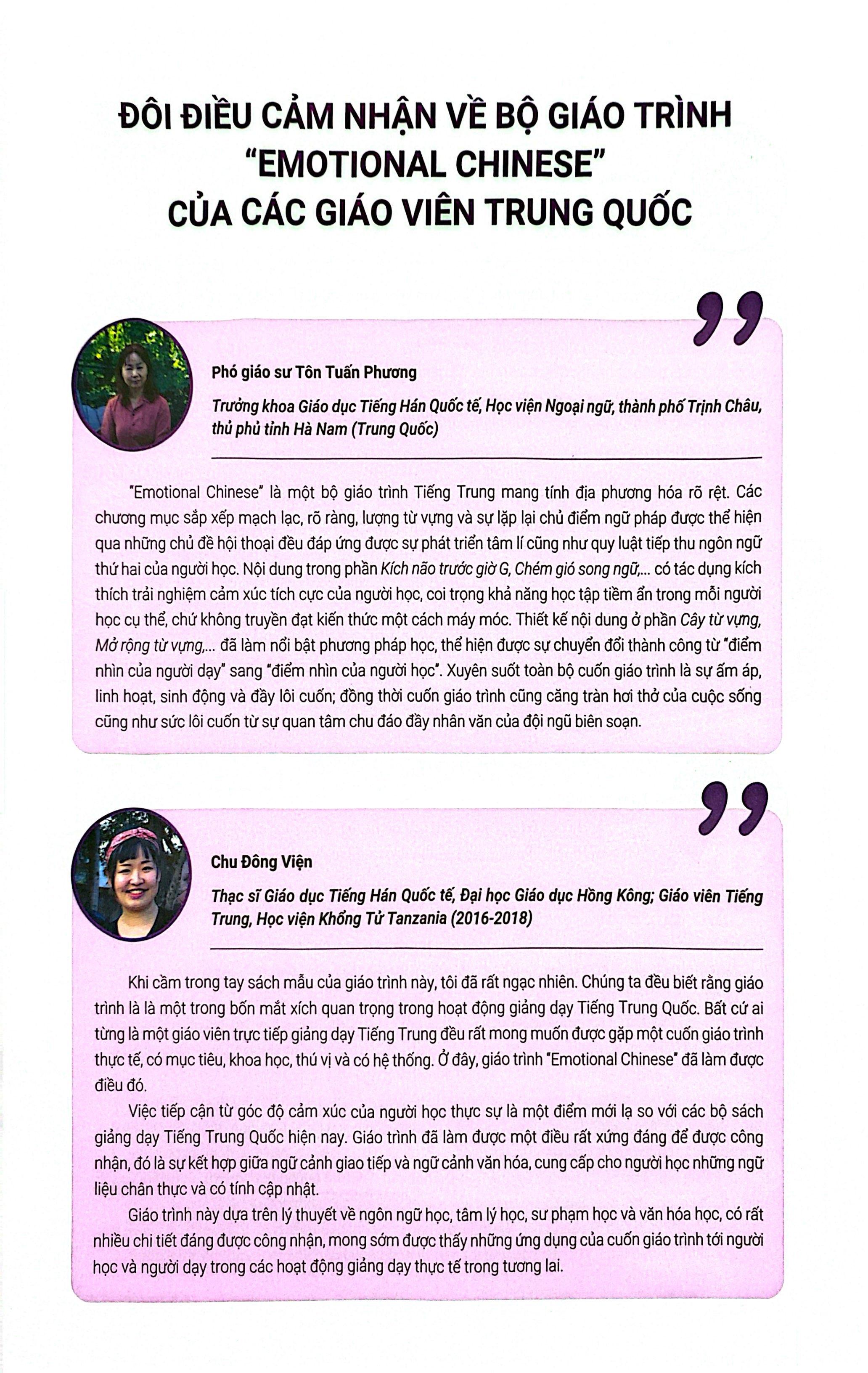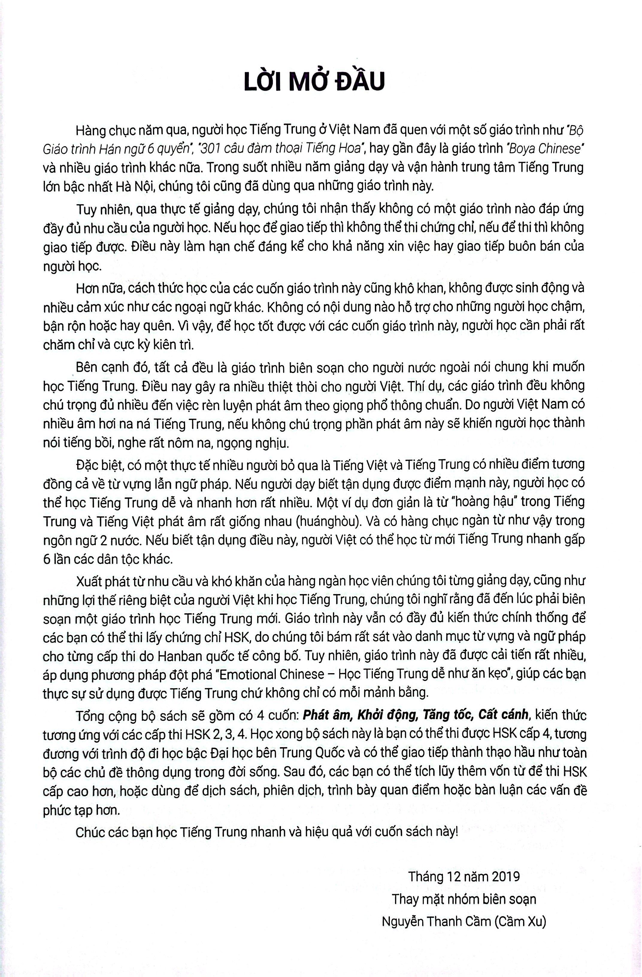 Emotional Chinese - Học Tiếng Trung Dễ Như Ăn Kẹo - Tập 3 Cất Cánh Giáo trình Cất cánh Emotional Chinese dành cho trình độ từ ½ HSK4 trở lên, hoặc những bạn đã biết giao tiếp tương đối ổn, nắm được khoảng 800 từ vựng, hoặc đã học xong cuốn Tăng tốc. Nội dung cuốn sách giúp bạn chinh phục 60% kiến thức còn lại của HSK4, hoặc đảm bảo bạn biết trình bày quan điểm, thảo luận, trao đổi về các chủ đề tương đối chuyên sâu như kinh tế, việc làm, đời sống công sở, văn hóa… Đây cũng là một trong những giáo trình hiếm hoi được in màu và thiết kế với nội dung sinh động, nhằm giúp bạn học Tiếng Trung một cách dễ dàng hơn. VỀ EMOTIONAL CHINESE Giáo trình Emotional Chinese Tiếng Trung Cảm Xúc là một trong những giáo trình đầu tiên do người Việt viết cho người Việt, khắc phục được những mặt khó khăn khi người Việt học Tiếng Trung. Giúp bạn vừa giao tiếp được, vừa nhớ được chữ Hán, vừa nắm vững ngữ pháp để tham gia các kì thi lấy chứng chỉ. Đặc biệt, thực tế Tiếng Trung và Tiếng Việt có rất nhiều điểm tương đồng cả về từ vựng và ngữ pháp. Nên nếu tận dụng được điểm này sẽ giúp người học có thể học nhanh và nhớ lâu hơn rất nhiều. Ví dụ từ "hoàng hậu" trong Tiếng Việt và Tiếng Trung phát âm rất giống nhau là "huáng hòu". Có hàng chục ngàn từ như vậy giữa ngôn ngữ 2 nước, nếu tận dụng được điểm này thì người học có thể học nhanh gấp 6 lần các dân tộc khác. Chủ biên bộ sách là Cô Nguyễn Thanh Cầm (Cầm Xu) - Cô giáo sở hữu kênh Youtube học Tiếng Trung nhiều lượt theo dõi nhất Việt Nam. Cô là người sáng lập, kiêm CEO của "Tiếng Trung Cầm Xu", chuỗi học Tiếng Trung lớn nhất Hà Nội, cô được xem là một trong những giáo viên dạy phát âm Tiếng Trung chuẩn nhất Việt Nam. ĐẶC ĐIỂM NỔI TRỘI CỦA EMOTIONAL CHINESE - TIẾNG TRUNG CẢM XÚC