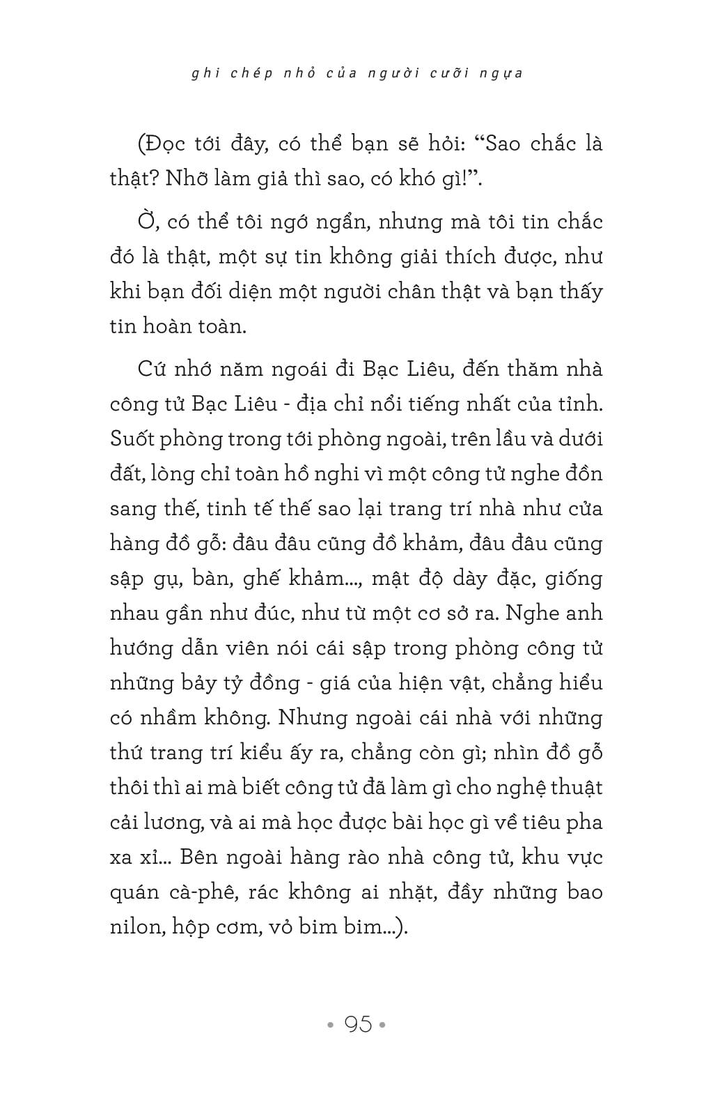 Ghi Chép Nhỏ Của Người Cưỡi Ngựa Những vấn đề chung mà hàng ngày ai cũng phải gặp. Từ việc đi làm, nghỉ ngơi, hay chơi ok... Cách nhìn vấn đề chi tiết và tinh tế, cách nêu vấn đề trực tiếp và sắc sảo đến tận cùng, cách viết gọn và sâu. Để có thể đồng cảm, tự nhắc m.ình – mà như là chia sẻ - cần phải “tự chịu trách nhiệm những gì m.ình làm và m.ình nói”. Cuốn sách vô cùng lôi cuốn chính vì những lý do trên. “Những vấn đề có khi cũng nhỏ thôi, nhưng người viết đã mở ra vô số cánh cửa, cánh nào cũng hứng gió ào ạt về… …Khi đã lùi xa khỏi sự kiện, tản văn của Phan Thị Vàng Anh là những bài học về phép ứng xử với cuộc sống, với chữ nghĩa, những thứ xem ra giới viết đã bàn nát nước nhưng làm được như thế lại là một chuyện khác, đòi hỏi không được buông tha sự quyết liệt của chính m.ình. Sự quyết liệt mà đa số chúng ta, sểnh ra là xẹp.”