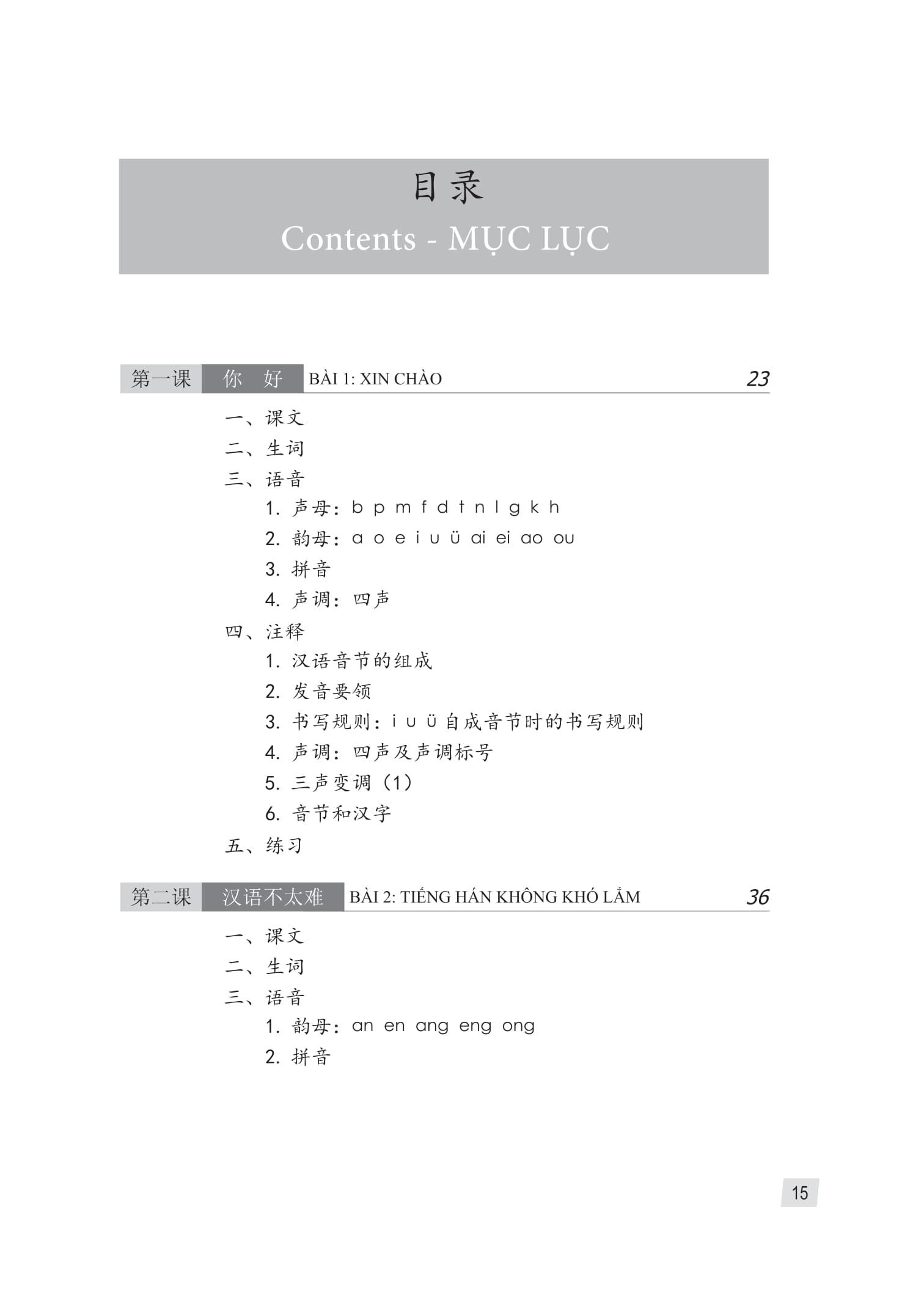 - Chú thích Phần chú thích trong giai đoạn ngữ âm chủ yếu giới thiệu kiến thức cơ bản về ngữ âm tiếng Hán. Còn ở giai đoạn ngữ pháp và mẫu câu, chủ yếu giới thiệu và giải thích một số kiến thức trọng điểm về ngôn ngữ và bối cảnh văn hóa Trung Quốc. Đối với những câu có điểm ngữ pháp xuất hiện trong bài khóa nhưng chưa được giải thích, hãy để sinh viên được hiểu nghĩa thông qua phần dịch nội dung chú thích.