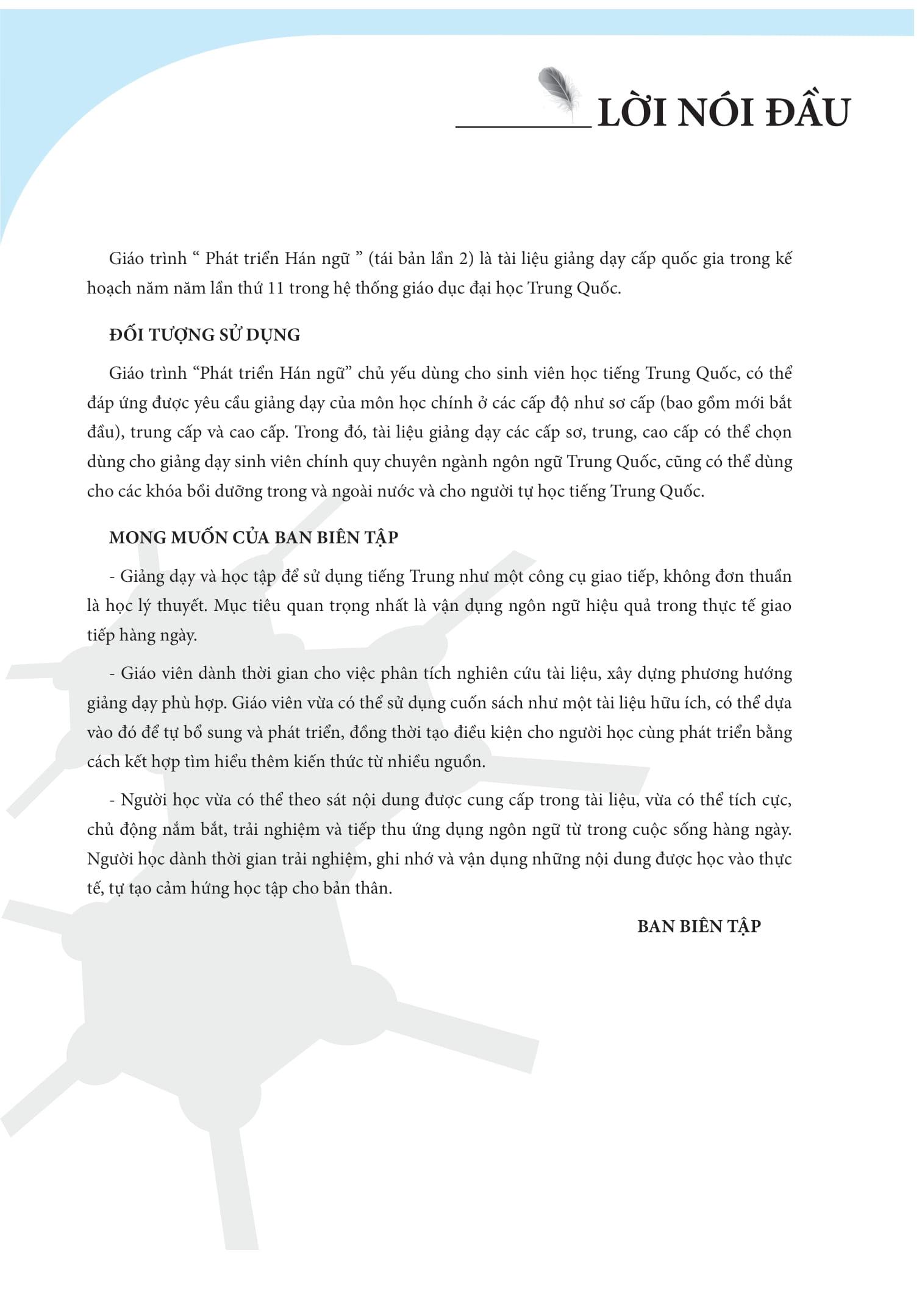 Giáo trình Phát triển Hán ngữ tổng hợp sơ cấp 1 chủ yếu dùng cho sinh viên học tiếng Trung Quốc, có thể đáp ứng được yêu cầu giảng dạy của môn học chính ở các cấp độ như sơ cấp (bao gồm mới bắt đầu). Bên cạnh đó, cuốn sách này có thể chọn dùng cho giảng dạy sinh viên chính quy chuyên ngành ngôn ngữ Trung Quốc, cũng có thể dùng cho các khóa bồi dưỡng trong và ngoài nước và cho người tự học tiếng Trung Quốc.