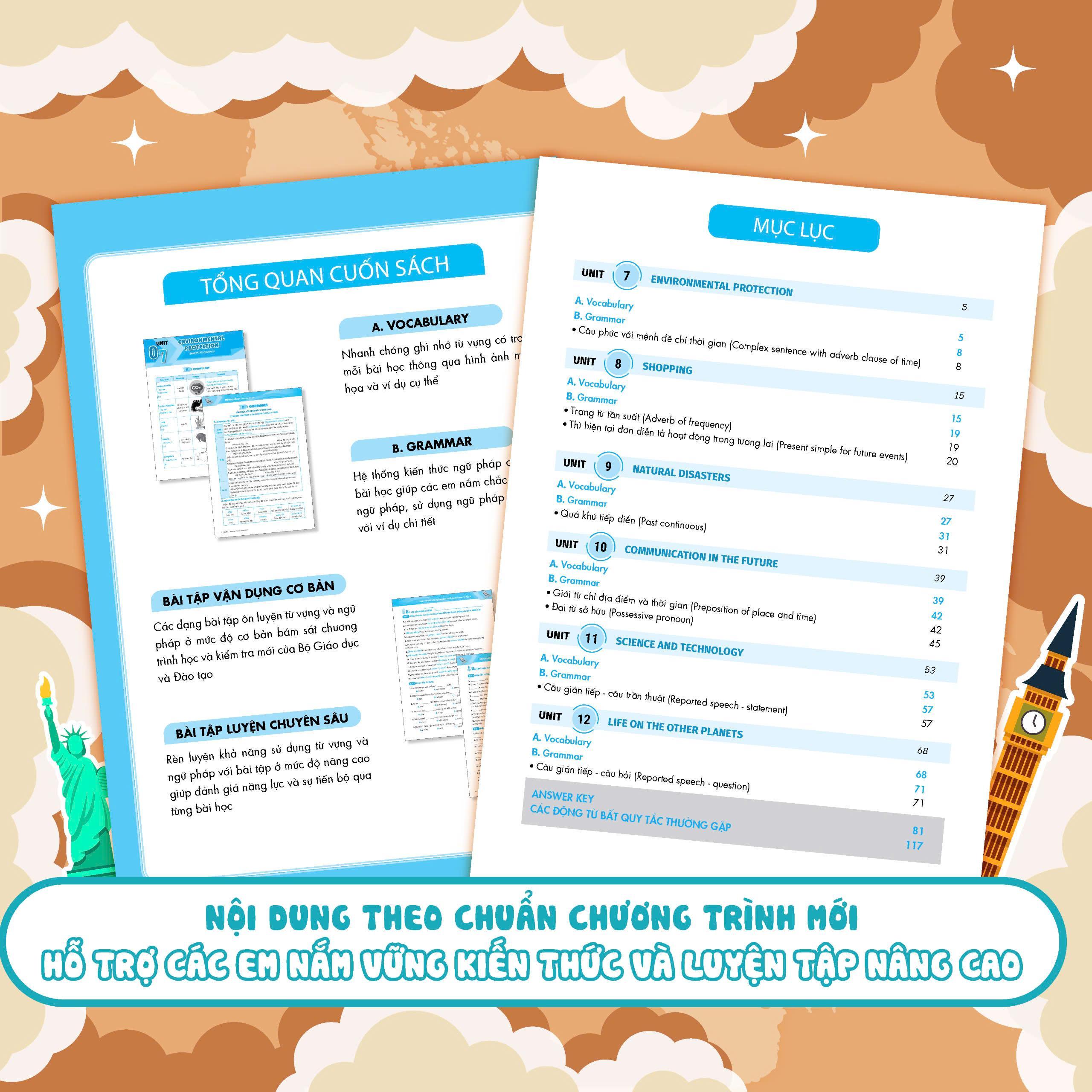 Nội dung bám sát khung chương trình giáo dục phổ thông mới Lớp 8 của Bộ Giáo dục và Đào tạo giúp các em nắm vững kiến thức đã học trên lớp cũng như ôn luyện thêm các bài tập nâng cao, hỗ trợ quá trình tự học tiếng Anh hiệu quả.