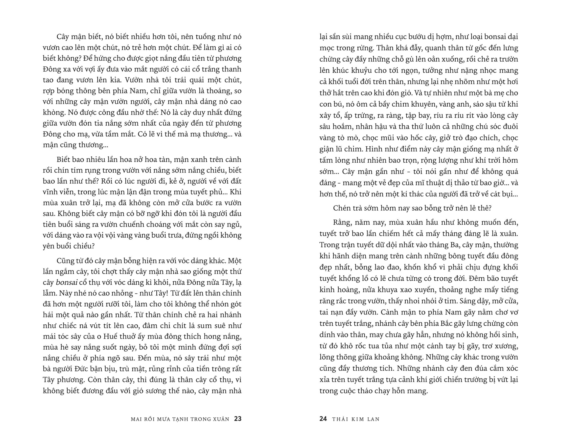 Lần bước theo cảm xúc trong tản văn Thái Kim Lan, người đọc sẽ cùng Tác giả vào Đường Sương, qua Đường Mưa để dần ngộ ra giữa chốn nhung nhớ ảo huyền ấy một MAI RỒI MƯA TẠNH TRONG XUÂN...