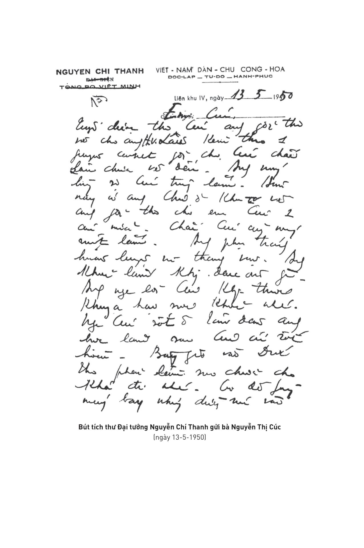 - Những cánh thư ra Bắc vào Nam TRÍCH ĐOẠN/ CÂU QUOTE HAY “Những lá thư này là một di sản Ba Thanh để lại, dành riêng cho con cháu, để họ truyền lại cho mãi mãi những lứa cháu con sau này… như những giọt sữa nuôi dưỡng trong cả cuộc đời, như những dòng máu tiếp tục chảy trong huyết quản” (Trích Lời mở đầu) “Không được thơ Cúc, anh phần thì trông mong, phần thì áy náy, không biết m.ình ăn ở với vợ con thế nào mà đến khi xa nhau phải thế. Em cũng biết tuy nhớ nhau nhiều ngày hay sinh ra nghĩ thế này thế khác, tâm lý ấy cũng có gì là lạ.” (Trích thư Đại tướng Nguyễn Chí Thanh gửi vợ Nguyễn Thị Cúc, ngày 5-7-1950) “Ba dặn các con đây này: Phải gắng học cho giỏi, tính nết cho tốt, làm việc cho khá. Ba chúc các con ngoan để sau này thành người có đạo đức.” (Trích thư Đại tướng Nguyễn Chí Thanh gửi gia đình, tháng 11-1964) “… Đại tướng Nguyễn Chí Thanh vẫn luôn hiện hữu trong cuộc đời chúng ta. Trong các văn kiện, tài liệu của Đảng và Nhà nước. Trong những bộ sách. Trong những cuốn phim. Qua các kỷ vật trong viện bảo tàng. Qua rất nhiều bài viết trên báo chí. Qua truyền hình và đài phát thanh. Với những bức tượng ở quảng trường, trong các khu lưu niệm. Với những miếu thờ giản dị nơi thôn dã...” (Trích Tòng Bạt) “Chúng ta đã đọc những bài báo của Đại tướng với bút danh “Trường Sơn” - những bài viết làm nức lòng dân tộc trong những năm đánh Mỹ. Chúng ta quen với một giọng văn đanh thép, sắc sảo, hào hùng, một tư duy sáng suốt đầy sức thuyết phục, một thái độ tận tụy, kiên trung quyết tâm chiến đấu và sẵn sàng hy sinh. Chúng ta cũng biết đến những bài nói sảng khoái, chân tình khi vị tướng nông dân lội bùn trên những cánh đồng hợp tác, điểm xuyết những câu hò man mác những triền sông. Chúng ta cũng đã đọc những câu chuyện phảng phất màu sắc huyền thoại nhưng lại rất thực, kể về một cán bộ lãnh đạo cao cấp cõng cấp dưới qua suối, hay một chỉ huy quân đội “bênh vực” một làn điệu quan họ. Bây giờ, đọc lại những bức thư viết từ khoảng xa là 69, gần là 49 năm trước, ta gặp lại vẫn Nguyễn Chí Thanh ấy, nhưng trong nỗi chờ mong thư vợ, mong đến mức tỷ mẩn đếm từng lá thư, băn khoăn đến mức so sánh số thư gửi đi với số thư nhận được, rồi nghĩ ra đủ thứ lý do để mà lo lắng, băn khoăn, nào là ốm đau, nào là giận hờn, nào là bom lửa… Ta thấy vị Đại tướng ngày nào sao mà gần gũi, sao mà thân thương, trong những khía cạnh hết sức đời thường. Giống như tôi, giống như bạn. Những lá thư trở nên tư liệu lịch sử đầy tính nhân văn.” … “Đọc mỗi lá thư như dò tìm trở lại từng bước chân trên cả con đường của một con người, một gia đình, những khắc khoải cách xa, những lo âu trĩu nặng, những dặn dò ân cần, những niềm vui, những khao khát trong lòng người chồng, người cha đang gánh vác biết bao nhiệm vụ nặng nề.” (Trích Lời mở đầu)