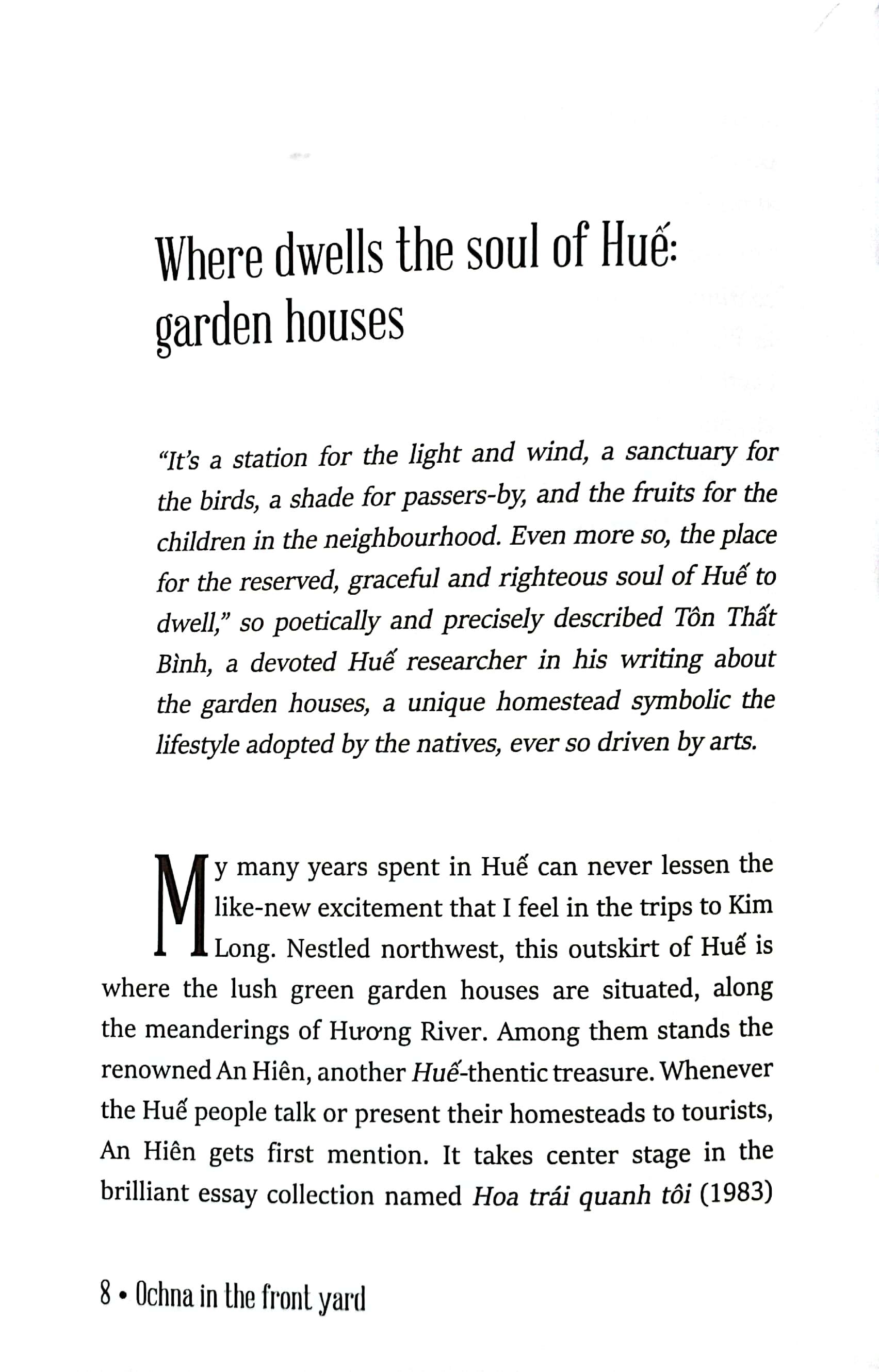 Đặc biệt, trong lần tái bản này, Nhà xuất bản Phụ nữ Việt Nam ấn hành Trước nhà có cây hoàng mai bản tiếng Anh với tựa Ochna in the front yard: Fascinating stories about Huế - an ancient, poetic and glamorous land để có thể giới thiệu với bạn đọc ngoại quốc vẻ đẹp kiêu sa, cổ kính của Huế.