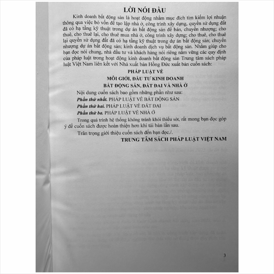 Nhằm phổ biến đến Quý Cơ quan, Đơn vị và Quý khách hàng thân thiết nắm bắt kịp thời những quy định mới nêu trên. Nhà sách Nam Việt xin trân trọng giới thiệu cuốn sách: Pháp Luật về Môi Giới, Đầu Tư Kinh Doanh Bất Động Sản, Đất Đai và Nhà Ở