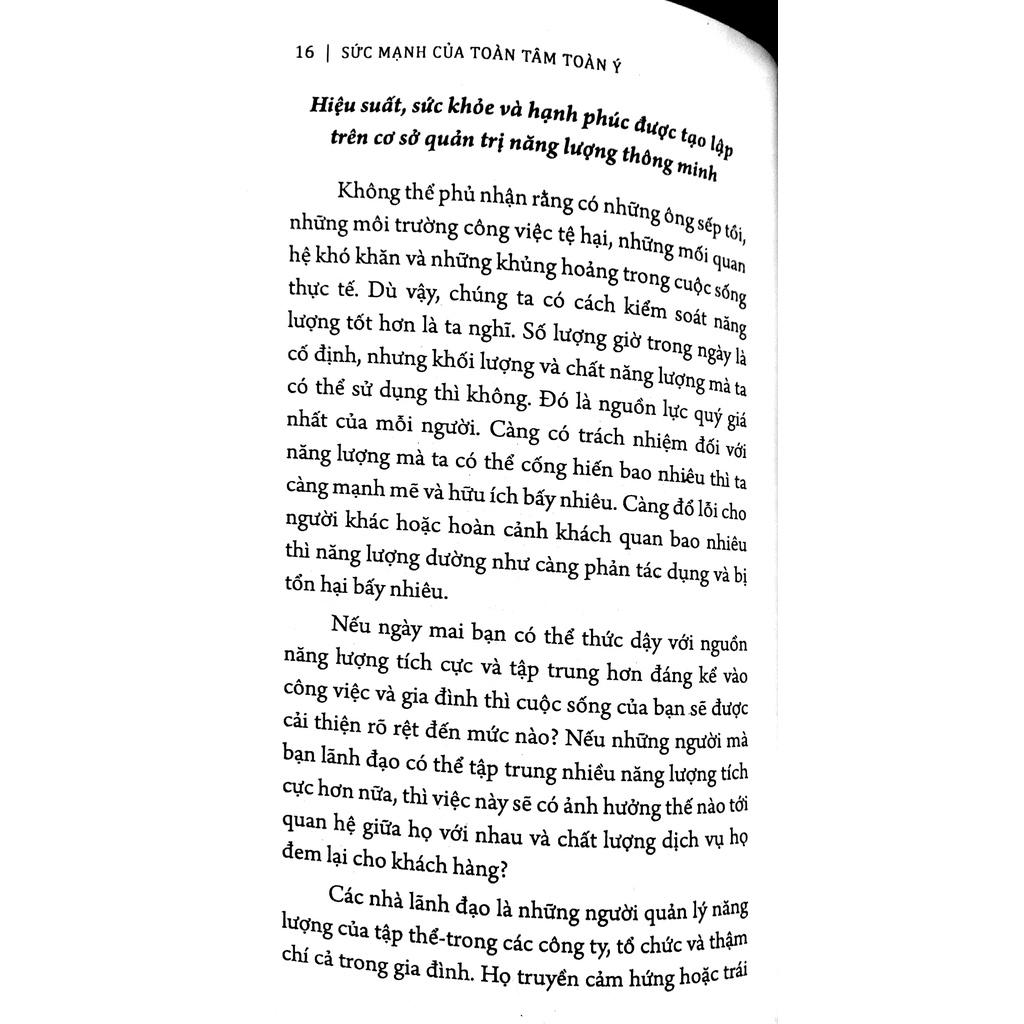 Sức mạnh của toàn tâm toàn ý là phương pháp rất thiết thực và có cơ sở khoa học để quản trị năng lượng của bạn theo cách thông minh hơn. Nó cho ta một chỉ dẫn rõ ràng để trở nên mạnh mẽ hơn về mặt thể chất, gắn bó hơn về mặt tình cảm, tập trung hơn về mặt trí tuệ và liên kết hơn về mặt tinh thần – cả trong công việc lẫn trong đời sống.
