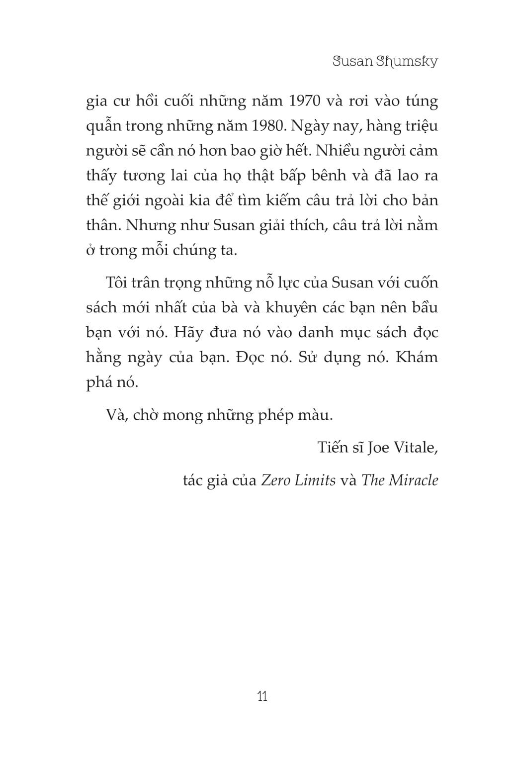Susan Shumsky nhấn mạnh, Đấng Tạo Hóa đã ban tặng mỗi người khả năng tiếp nhận của cải vô tận. Tuy nhiên, chỉ khi thay đổi tâm thức và sẵn sàng mở lòng, bạn mới có thể nhận lấy những điều tuyệt vời vốn thuộc về m.ình. Cuốn sách không chỉ là một cẩm nang giúp bạn giàu có hơn, mà còn là hành trình chuyển hóa từ bên trong, mang lại sự bình an, hạnh phúc và thành công lâu dài.