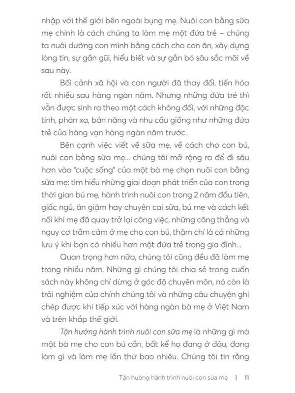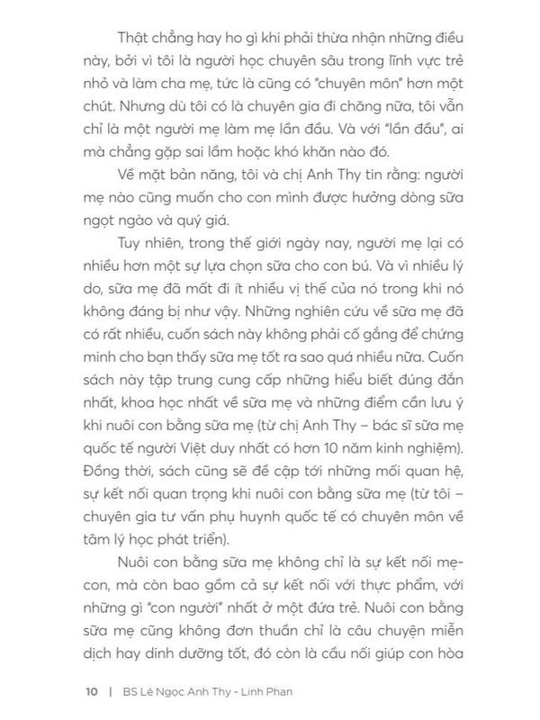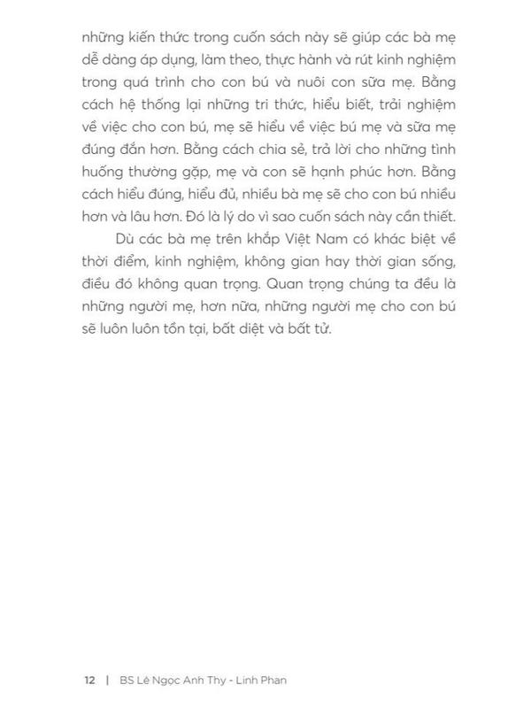 Mua tại TiktokKích thước: 14.5x20,5 cm Giới thiệu sách “Như một lẽ tự nhiên và như bản năng, các loài động vật có vú khi sinh ra đã có sữa mẹ của chúng để bú trong những tháng sơ sinh trước khi chúng biết ăn. Loài người không phải là ngoại lệ. Tuy nhiên, do nhiều lý do như tâm lý hay bệnh lý của bà mẹ, sự quảng cáo (đôi khi không đúng sự thật) của nhiều hãng sữa, hay do nhiều nguồn thông tin sai lệch, mà nhiều bà mẹ ở Việt Nam đang rất hoang mang khi cho bé bú mẹ. Với tâm huyết và kinh nghiệm của nhiều năm tư vấn cho các bà mẹ nuôi con bằng sữa mẹ, bác sĩ Anh Thy đã đúc kết những kiến thức quý báu về sữa mẹ để cho ra đời cuốn sách Tận hưởng hành trình nuôi con bằng sữa mẹ. Với văn phong gần gũi và dễ hiểu, cuốn sách này sẽ là hành trang không thể thiếu của bà mẹ trong việc mang lại cho bé yêu nguồn dinh dưỡng quý giá nhất trong những năm tháng đầu đời của bé, giúp bà mẹ tự tin thực hiện thiên chức của mình trong hành trình nuôi con bằng sữa mẹ.” BS Nguyễn Trí Đoàn, Trưởng khoa Nhi phòng khám quốc tế Victoria Healthcare, tác giả cuốn Để con được ốm “Sữa mẹ đối với nhiều người rất dễ dàng có được, cho con bú mẹ thật đơn giản, nhưng cũng có người còn khó khăn, còn hoài nghi khi cho con bú sữa mẹ. Cuốn sách này sẽ cung cấp cho mọi người những kiến thức cơ bản về vai trò của sữa mẹ cũng như những tình huống khó khăn đối với những người mẹ khó thực hiện khi nuôi con bằng sữa mẹ.” BS Trương Hữu Khanh, nguyên Trưởng khoa Nhiễm – Thần kinh, Bệnh viện Nhi Đồng 1 TP. HCM, tác giả cuốn Hỏi bác sĩ nhi đồng Tác giả BS Lê Ngọc Anh Thy đã có hơn 10 năm kinh nghiệm hỗ trợ các mẹ sữa, từng là bác sĩ gây mê hồi sức tại các bệnh viện lớn ở TP. HCM. Năm 2010, chị sinh bé trai và nuôi bé bằng sữa mẹ. Chị bén duyên với nghề tư vấn sữa mẹ khi được người bạn cũ mời chia sẻ trên group Nuôi con bằng sữa mẹ trên mạng xã hội. Sau đó, BS Anh Thy học chuyên sâu về sữa mẹ trong 2 năm và trở thành người đầu tiên tại Việt Nam lấy được chứng nhận Chuyên gia tư vấn sữa mẹ quốc tế IBCLC (Internal Board Certified Lactation Consultant) năm 2015. Cuối 2019, BS Anh Thy đến Trung tâm sữa mẹ quốc tế tại Toronto, Canada để học thêm nhiều kinh nghiệm thực tế. Linh Phan theo học lĩnh vực tâm lý học phát triển/tâm lý trẻ em và đang là thành viên của Hiệp hội Trị liệu Tâm thần dành cho gia đình tại Na Uy. Linh cũng đồng thời là một huấn luyện viên phụ huynh chuyên nghiệp (Certified Parent Coach) và là một tác giả sách. Linh hiện đang sống và làm việc cùng gia đình với hai con trai tại Na Uy.