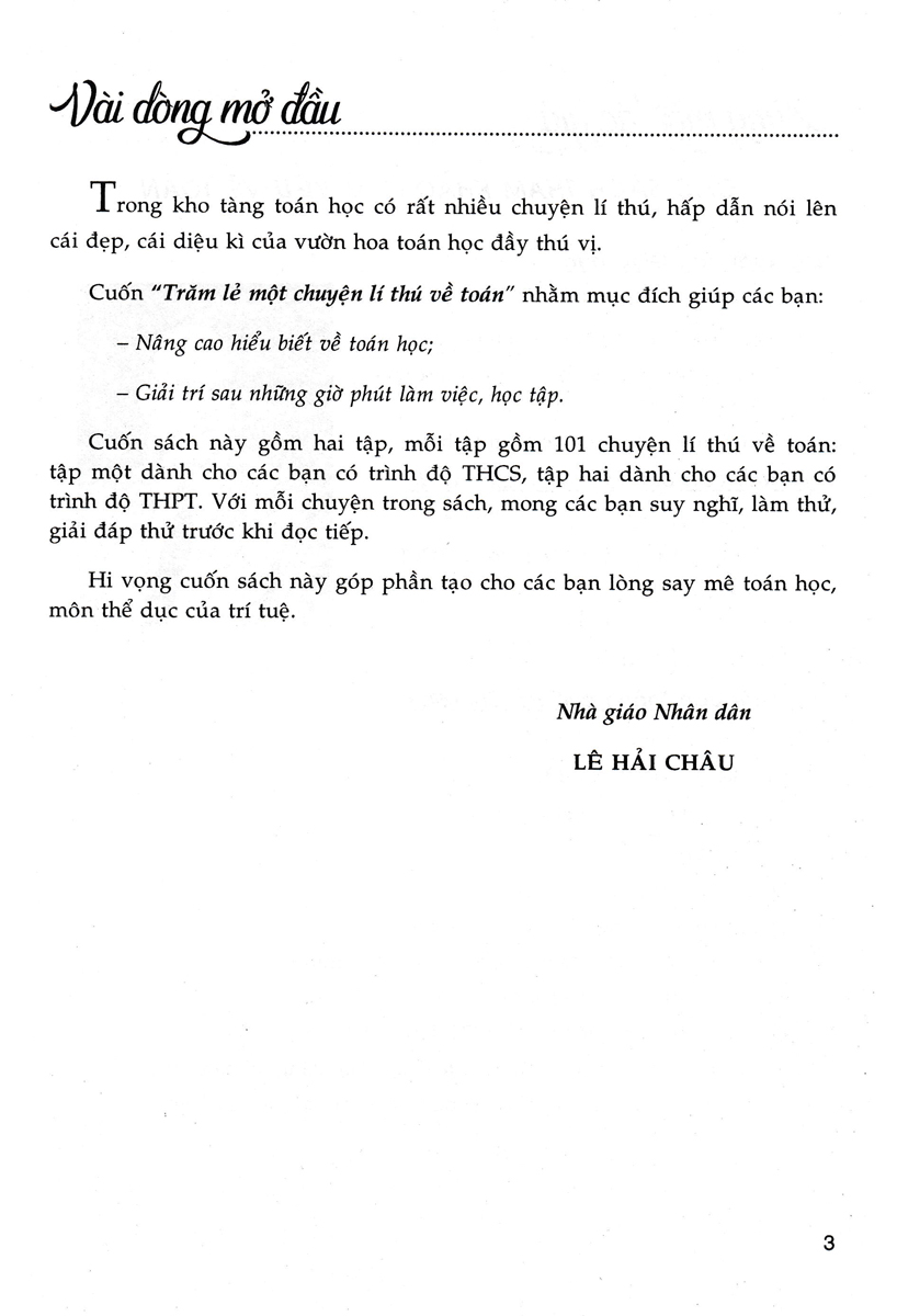 - Giải trí sau những giờ phút làm việc, học tập. Cuốn sách này gồm hai tập, mỗi tập gồm 101 chuyện lí thú về toán: tập một dành cho các bạn có trình độ THCS, tập hai dành cho các bạn có trình độ THPT. Với mỗi chuyện trong sách, mong các bạn suy nghĩ, làm thử, giải đáp thử trước khi đọc tiếp. Hi vọng cuốn sách này góp phần tạo cho các bạn lòng say mê toán học, môn thể dục của trí tuệ.