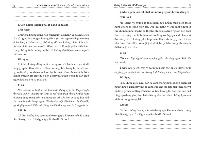 - Giải quyết mối quan hệ;… TINH HOA NLP cấp độ nhà thực hành (NLP Practitioner) được thiết kế đặc biệt để giúp bạn tiếp nhận kiến thức, kỹ năng mới không chỉ ở cấp độ ý thức, mà còn tác động đến cả tiềm thức của bạn. Với sự chuẩn hóa trong từng bộ công cụ NLP, cuốn sách đem đến cho bạn những trải nghiệm thú vị và đột phá thông qua những kỹ thuật đặc biệt của NLP. Vì thế, những công cụ này sẽ dễ dàng trở thành một phần tự nhiên trong bạn, giúp bạn ứng dụng được ngay khi đọc sách. Cuốn sách thực sự DỄ ĐỌC - DỄ HIỂU - DỄ THỰC HÀNH. TẠI SAO BẠN CẦN ĐỌC SÁCH NÀY?
