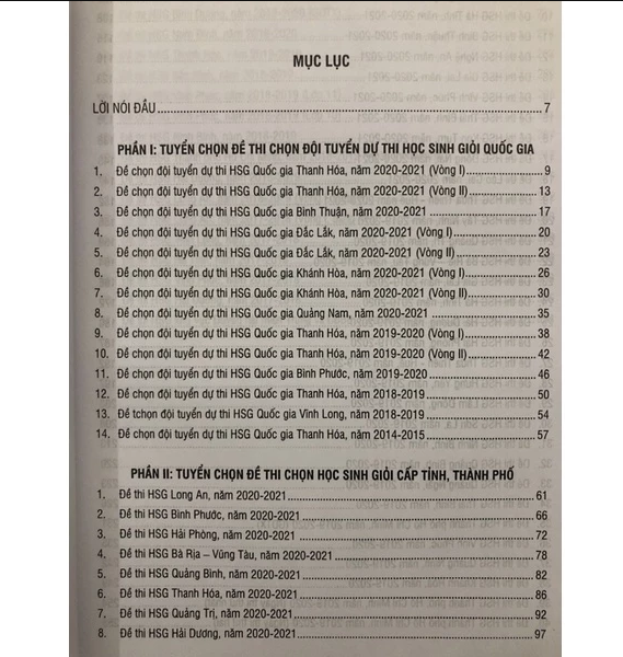 Mua tại TiktokNội dung gồm có: Phần I: Tuyển chọn đề thi chọn đội dự tuyển thi học sinh giỏi quốc gia Phần II: Tuyển chọn đề thi chọn học sinh giỏi cấp tỉnh, thành phố Tất cả các đề đều có đáp án và thang điểm chi tiết Đây sẽ là tài liệu hữu ích cho các em học sinh và các thầy cố giáo trong quá trình ôn luyện, bồi dưỡng học sinh giỏi. Chi tiết sản phẩm Tác giả: Kim Hà Sô trang: 359 Xuất bản: 2022 Nhà xuất bản: Đại học quốc gia Hà Nội Công ty phát hành: NXB Đại Học Quốc Gia Hà Nội