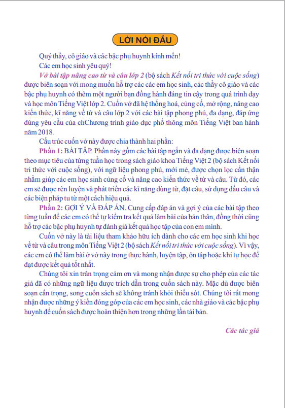 Phần 1: BÀI TẬP. Phần này được biên soạn theo từng tuần tương ứng với các tuần học trong chương trinh sách giáo khoa Tiếng Việt 2 Kết Nối tri thức với cuộc sống. Hệ thống bài tập được biên soạn theo mục tiêu của từng tuần/ bài học, với ngữ liệu phong phú, mới mẻ, được chọn lọc cẩn thận nhằm giúp các em học sinh cũng cố và nâng cao kiến thức về tử và câu. Từ đó, các em sẽ được rèn luyện và phát triển các kĩ năng dùng tử, đặt câu, sử dụng dấu câu và các biện pháp tu từ một cách hiệu quả.