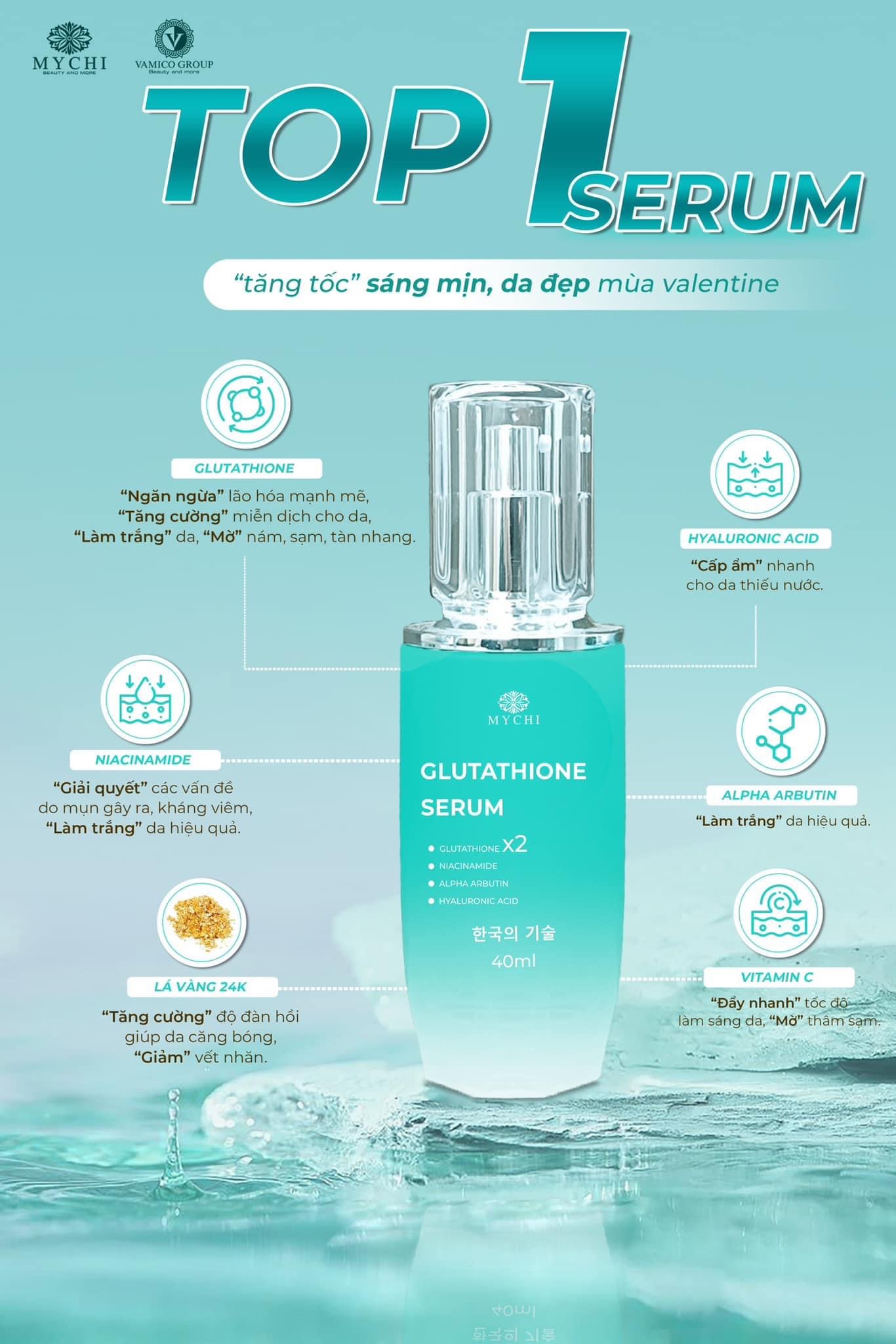 Serum Mychi - Serum cấy trắng lá vàng 24k glutathione 1.CÔNG DỤNG - Dưỡng da trắng sáng, mờ thâm sạm, giúp đồng đều sắc tố da - Chống oxy hóa da, cải thiện tình trạng