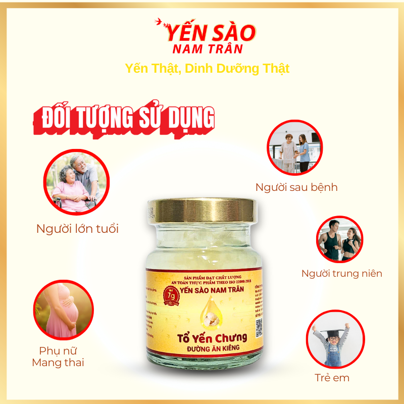 - Yến sào: Hỗ trợ tăng sức đề kháng cho cơ thể, chống lão hóa, ổn định thần kinh, trí nhớ, kích thích tiêu hóa, phục hồi sức khỏe nhanh chóng trong thời gian dưỡng bệnh. Đối tượng sử dụng: thích hợp cho mọi đối tượng đăc biệt trẻ từ 3 tuổi trở lên Sản xuất: Việt Nam Thành phần:  Nước, , Yến sào (25%), đường phèn (4%) , chất ổn định (E406), hương liệu dùng cho thực phẩm.  Cách dùng: - Lắc nhẹ trước khi uống, ngon hơn khi uống lạnh, tránh đun nóng sản phẩm trước khi sử dụng. - Uống trực tiếp từ lọ. --Uống từ 1 - 2  lọ/ngày. Sản phẩm thích hợp cho người lớn tăng sức đề kháng giúp cơ thể khỏe mạnh, phục hồi sức khỏe cho người bệnh,  Không sử dụng sản phẩm khi hết hạn, nên sử dụng một lần sau khi mở nắp.