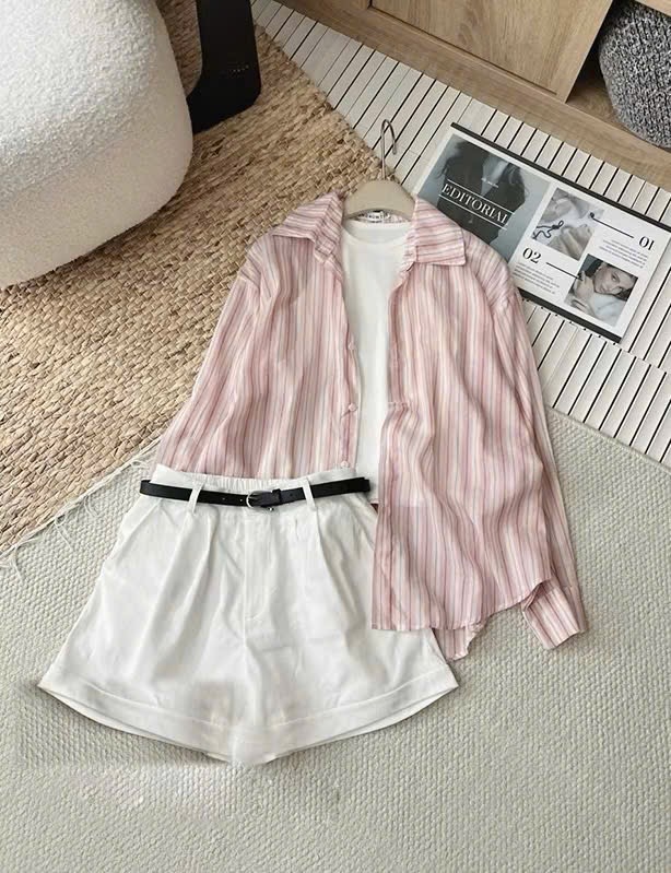 ✨Set 3 Món Áo Ba Lỗ Mix Quần Short Trắng Mix Áo Sơ Mi Sọc Dáng Rộng Kèm Dây Lưng
